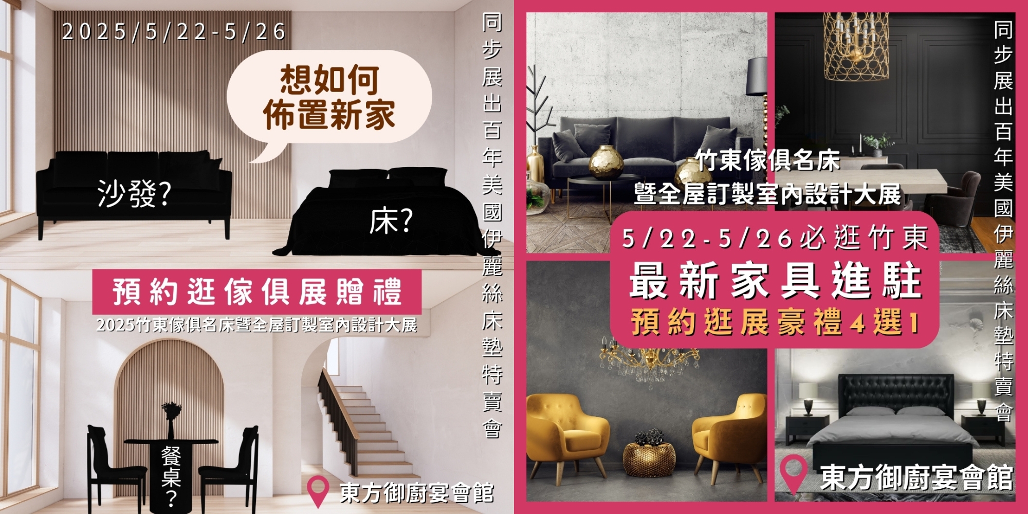 2025年特邀專業設計團隊進駐新竹東方御廚-宴會廳,首度展出2025年最新款沙發、茶几、床墊、系統櫃...等,保證獻給鄉親最新最優惠的活動與價格!「新竹竹東限定專場!傢俱名床暨全屋訂製室內設計大展」特蒐百大流行居家風格,另外難得特別邀約「百年美國伊麗絲與艾瑞塔床墊特賣會」共襄盛舉,謹訂於5/22(四)~5/26(一) 東方御廚餐廳-宴會廳(新竹縣竹東鎮大林路175號)舉辦新竹新品家具名床大回饋,商品眾多絕對讓你耳目一新,歡迎蒞臨免費參觀!