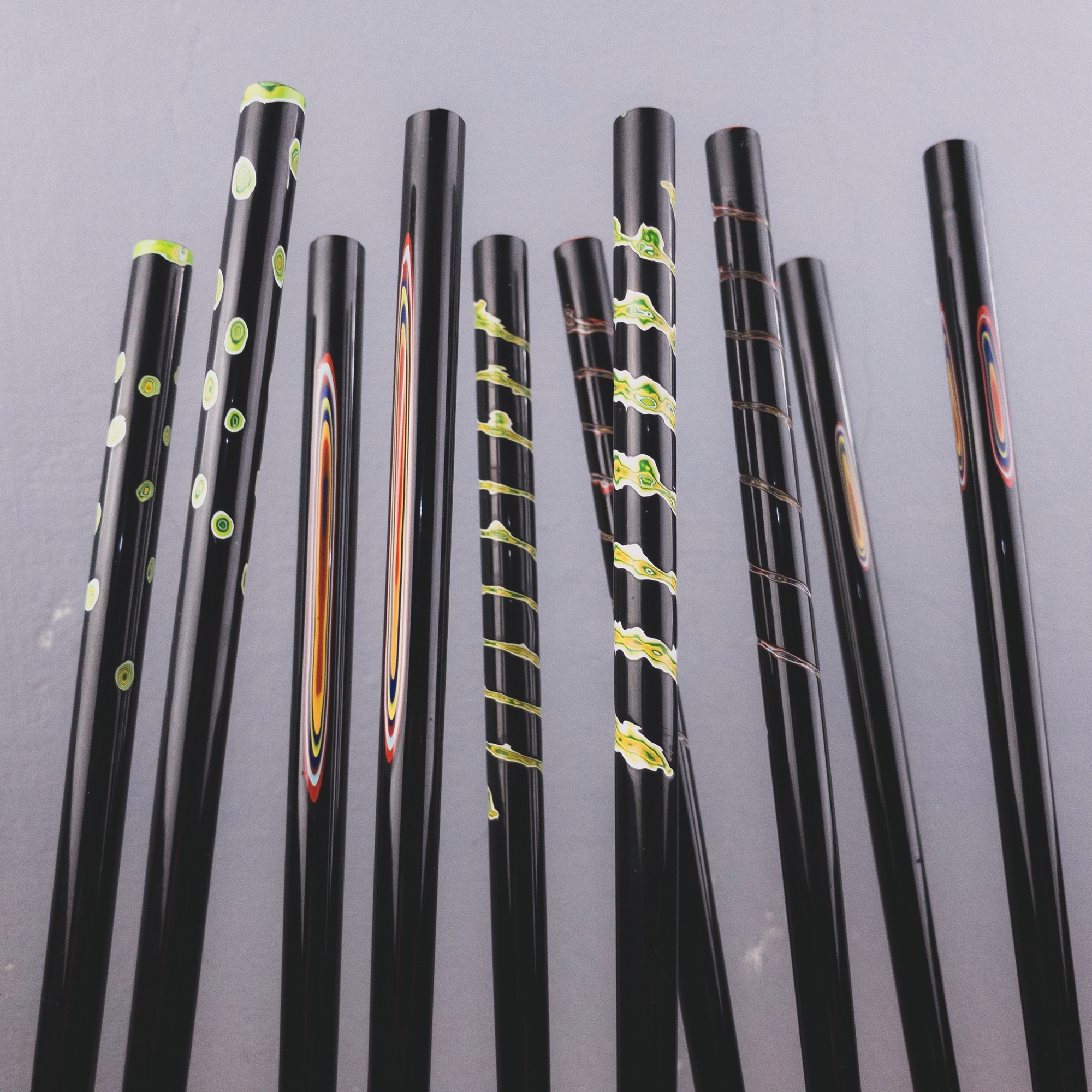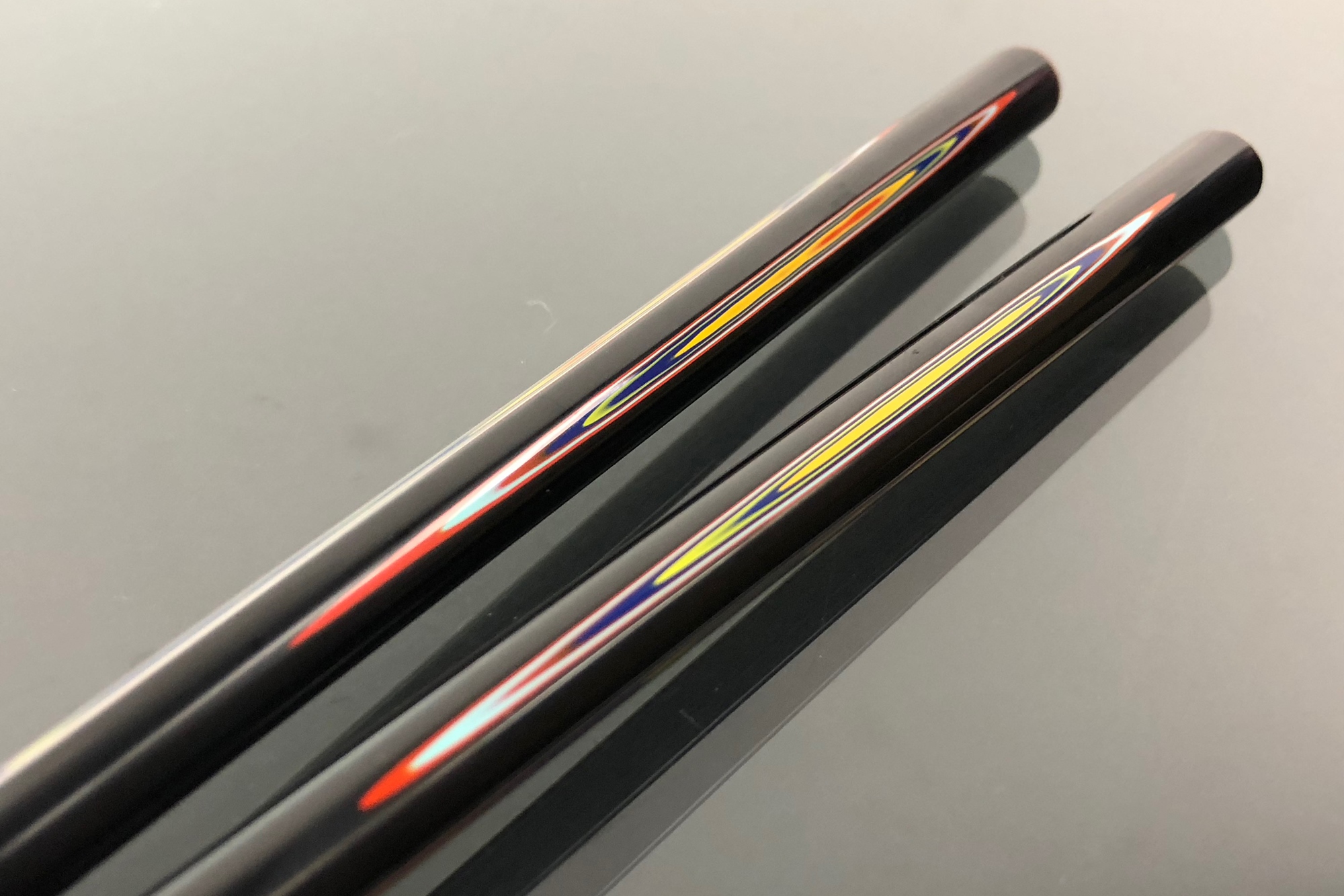 ▲由光山行獨創的「堆漆技法」所製成的漆筷胚體,因層層堆疊的漆色豐富多樣,經由研磨過程產生的特殊紋路及漸層變化,讓每一件漆筷都是獨一無二的創作。