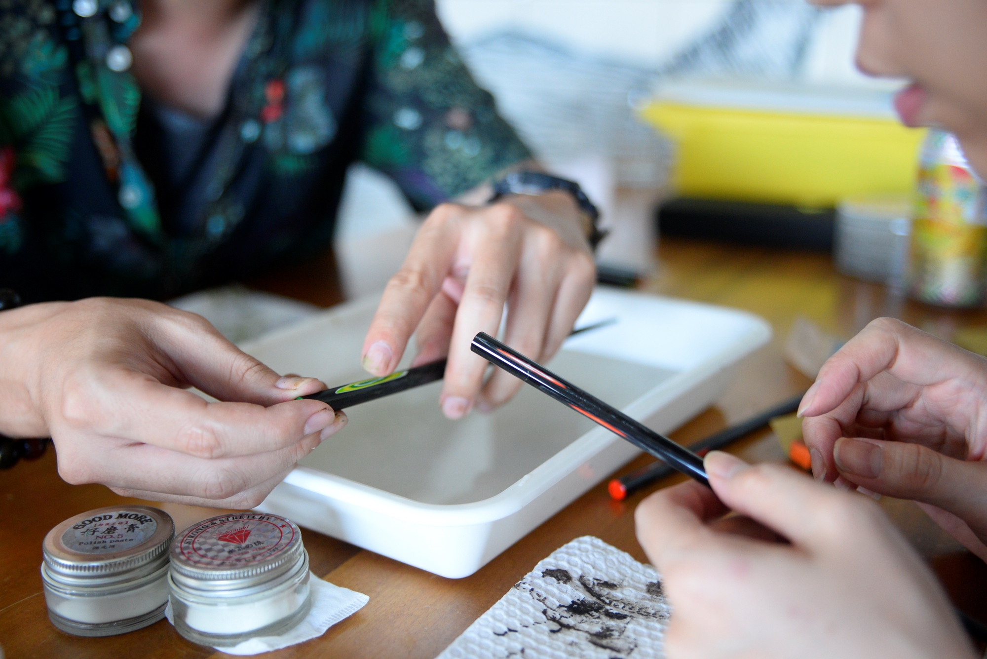 因漆器塗裝過程漫長,從木頭到 30層顏色的包覆,一日一層自然乾燥,大概需要一個月時間,所以我們擷取漆器製作過程中,最好玩的步驟:研磨推光,用不同粗細的水砂紙取代畫筆,在漆筷上創作出屬於你個人特色的美麗圖騰。