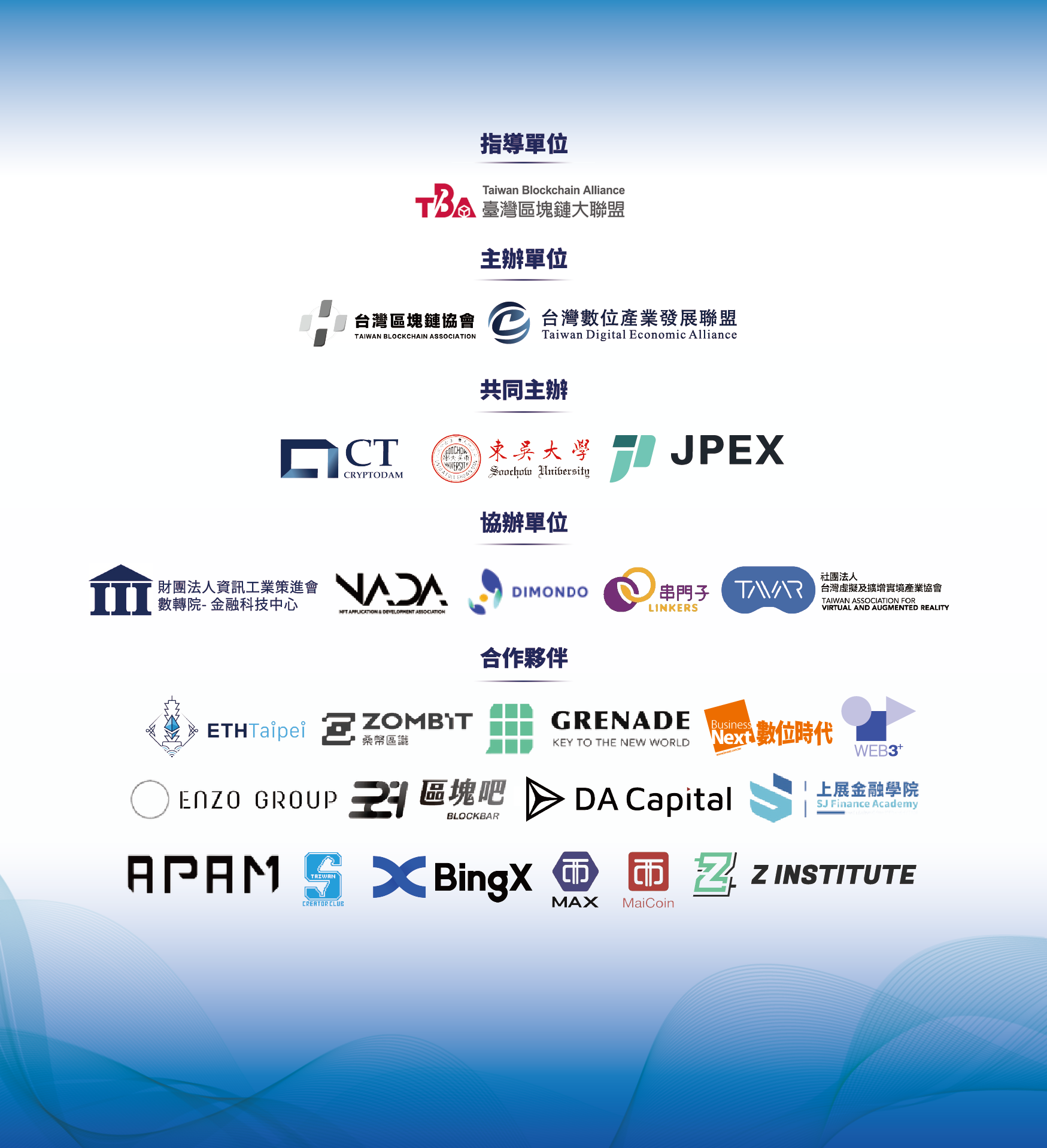 合作夥伴:ETH Taipei、ZOMBIT桑幣區識、Grenade手榴彈、數位時代、Web3+、Enzo Group、區塊吧Blockbar、DA Capital、上展金融學院、APAM艾恩科技、The Sandbox台灣創作者協會、BingX、Maicoin集團、The Z Institute