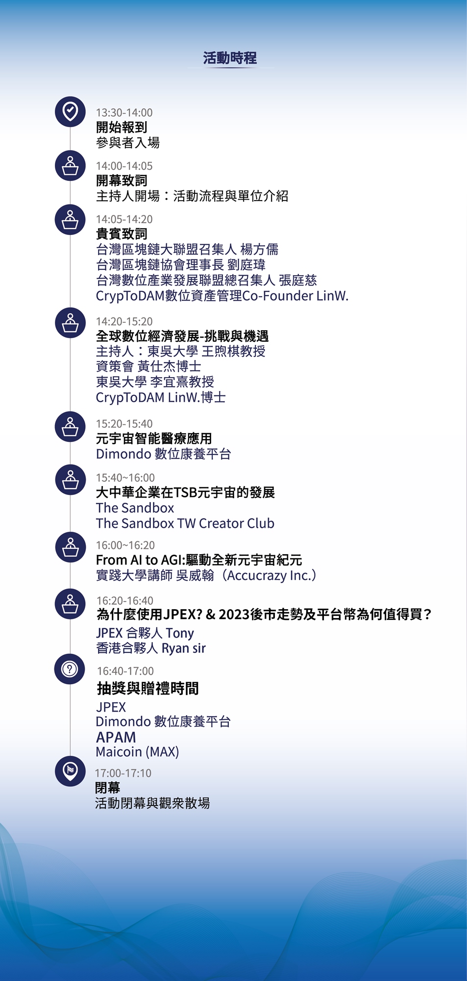 協辦單位:資策會數轉院金融科技中心、台灣NFT協會、Dimondo數位康養平台、串門子聯誼會Linkers、台灣虛擬及擴增實境協會、東吳大學海量資料分析研究中心