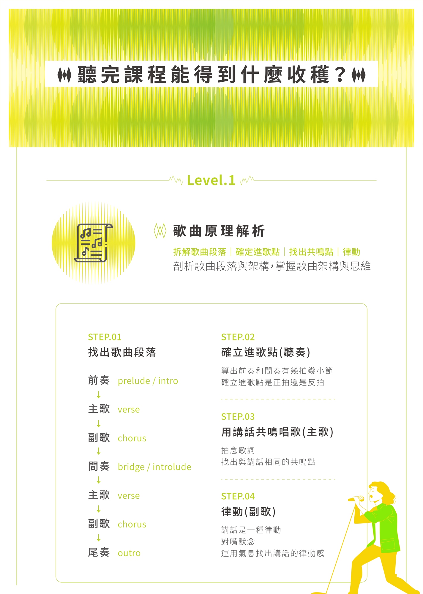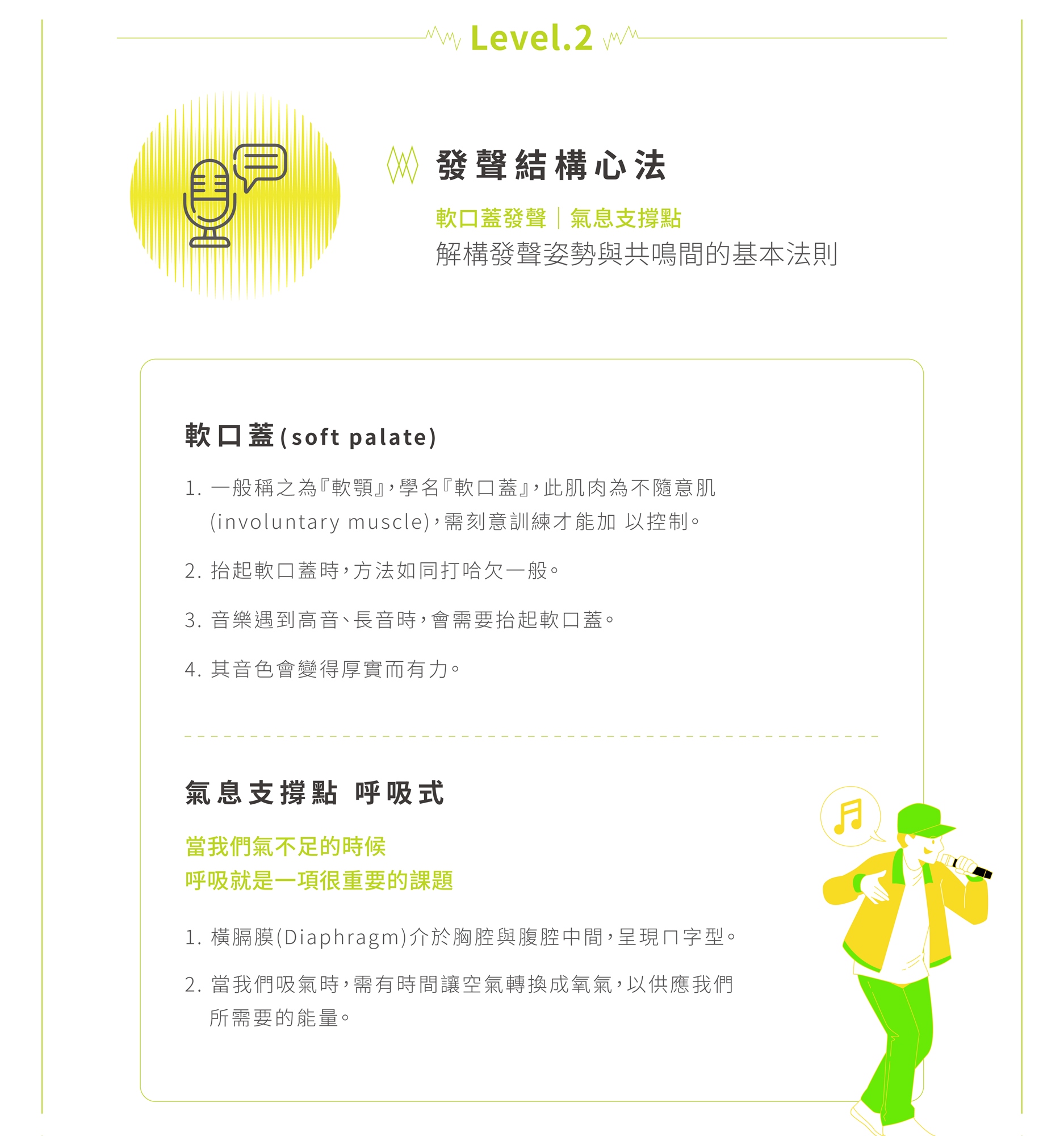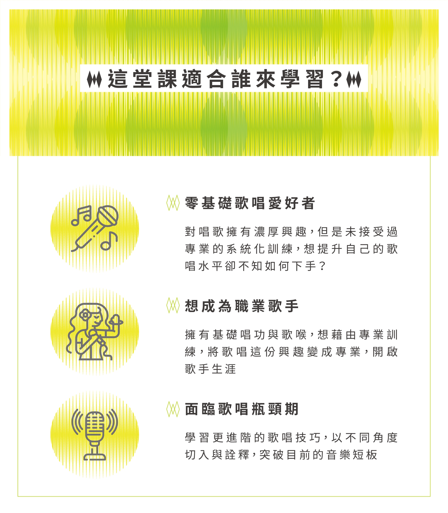 此次講堂將採用手把手的授課方式,透過系統化訓練,穩固歌唱實力的地基