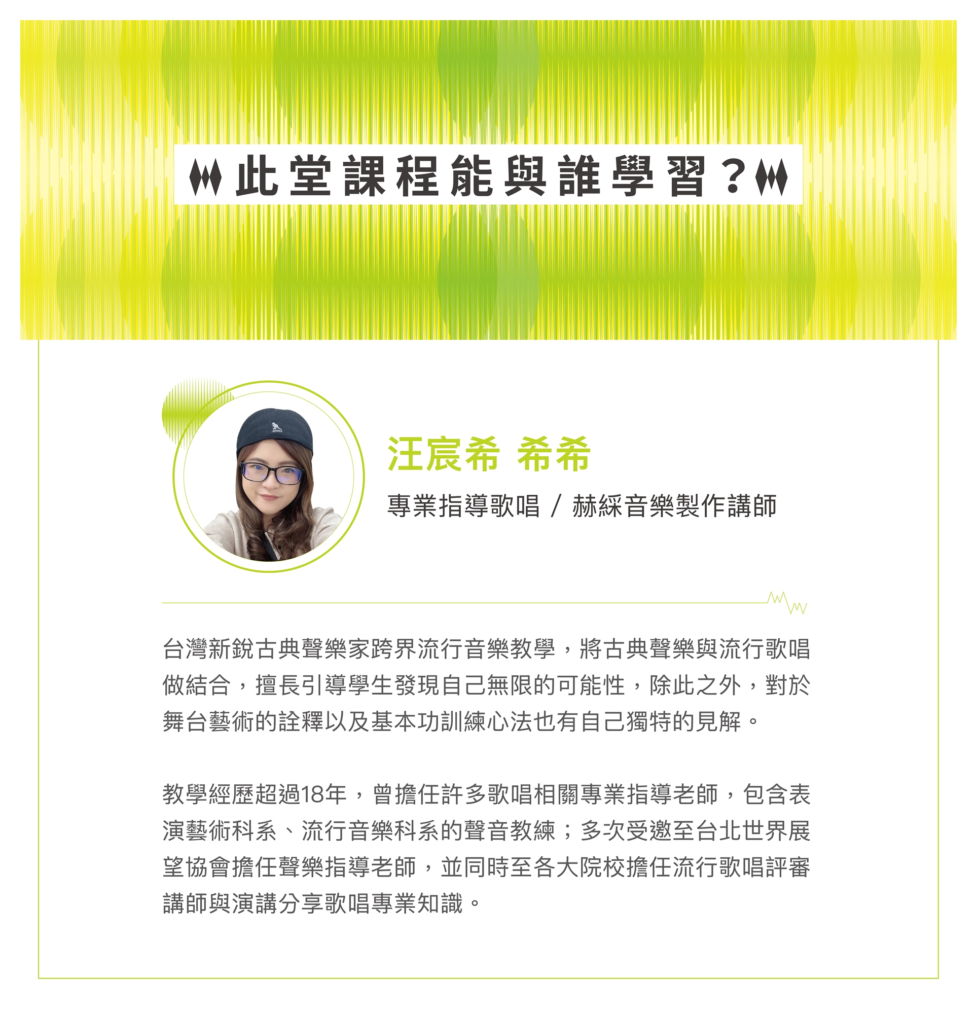 本次特別邀請到擁有豐富歌唱指導經驗的講師【汪宸希 希希】