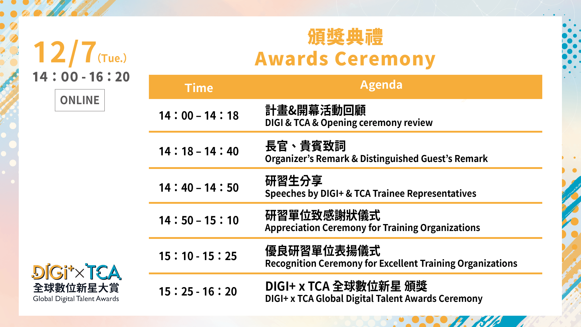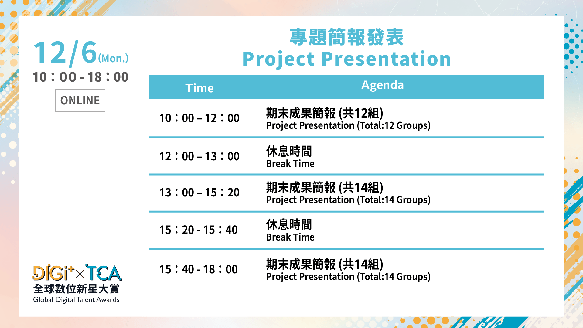 For the past six months, the “DIGI+ Talent Accelerator and Jumpstart Program” and the “Talent Circulation Alliance Program” have been working tirelessly together with the Training Institution to develop interdisciplinary digital skills for both Taiwanese and foreign students. Now, we present to you the “DIGI+ x TCA Global Digital Talent Awards,” an event showcasing our trainees’ exceptional final presentations! For those who are interested in interdisciplinary studies or talent cultivation, come join our event!