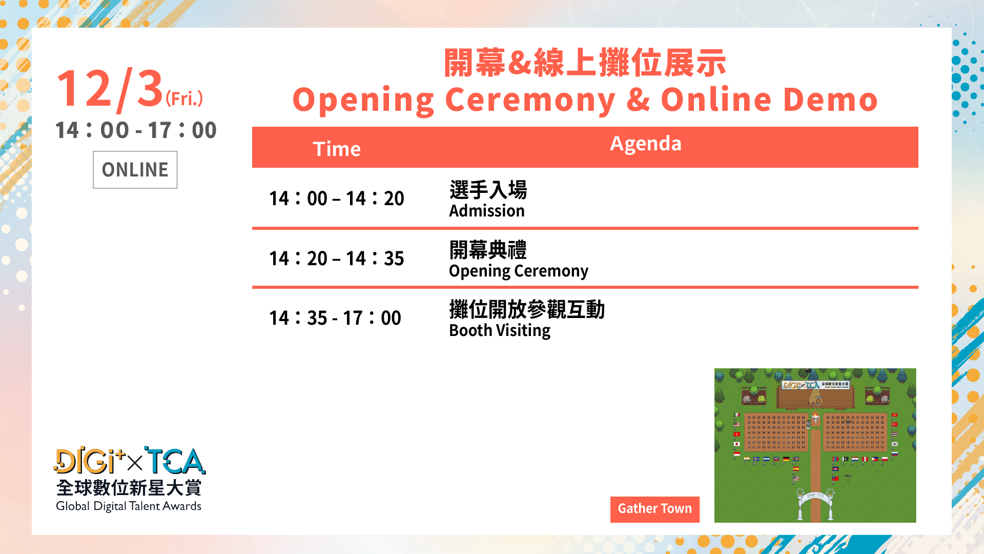 第一天的開幕將於Gather Town舉行,由跨國選手一一進場點燃聖火,各運動展區的攤位將呈現線上互動展演,民眾可自由深入各攤位與選手輕鬆交流,並因線上機制可達到不被其他攤位打擾的觀展體驗。我們也在展區各處精心設置了大地尋寶遊戲與闖關遊戲,完成後還可以參加抽獎,一定要來玩!