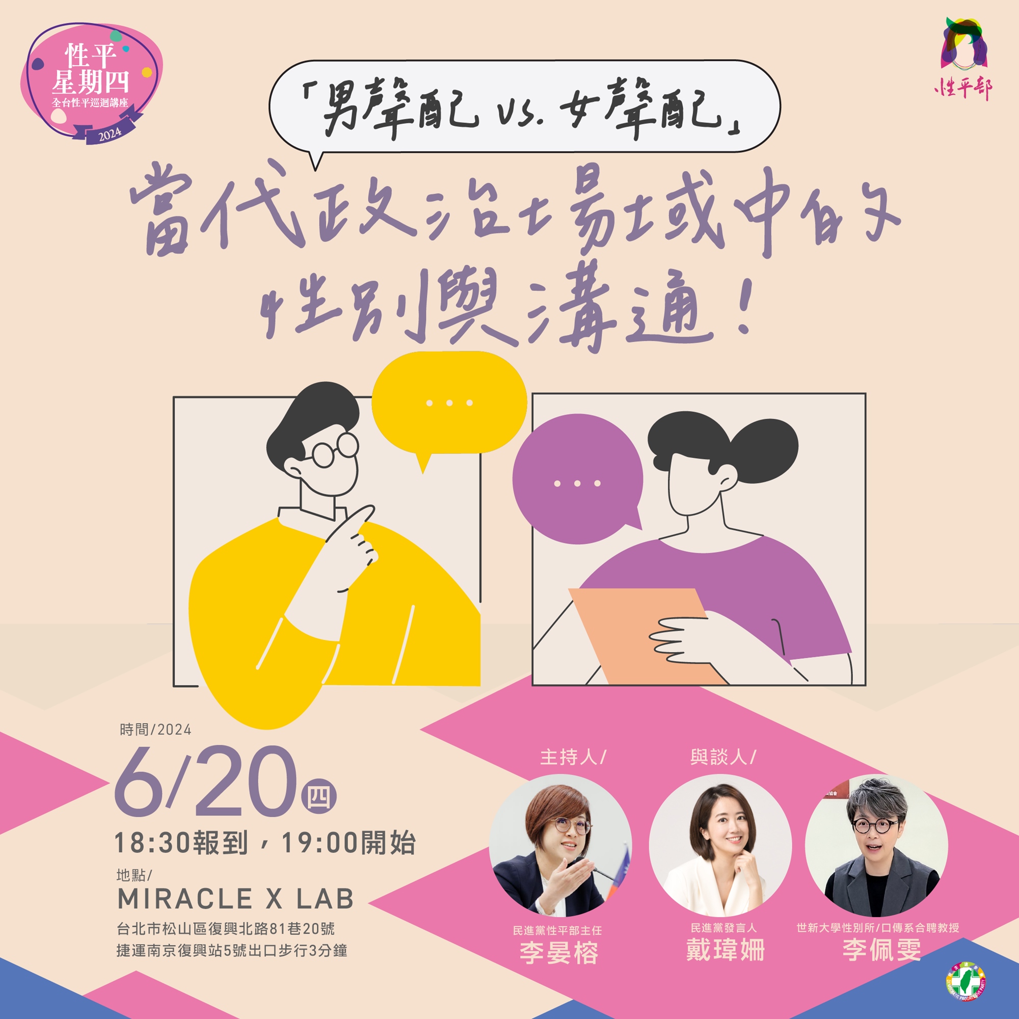 最近國會亂象的這段期間,我們看到在政治場域當中「溝通」的重要性,為政者如果不顧人民的意志,不願意傾聽回應公民的聲音,那便是濫權、獨裁的開端。這也是為何政黨中的發言人系統如此重要,發言人除了代表政黨發言之外,也作為接觸媒體、公民群體的第一線。因此,性平部這次邀請到民進黨的發言人戴瑋姍,與我們分享她作為女性發言人,在政治場域內,如何溝通、協商,讓民眾跟政黨能夠相互理解?女性身分有沒有影響作為發言人的工作體驗與實踐?政治溝通不脫生活,我們也邀請了以促進生活世界的溝通實踐為信念,長期關注性別關係與跨文化研究的世新大學口傳系教授李佩雯來跟大家深入淺出的分享溝通的理論與實踐。