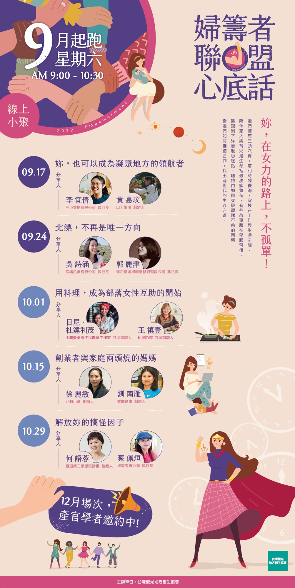 台灣觀光地方創生協會致力串聯各地資源,並嘗試改善整體環境,捲動社會走向永續發展。2022年聚焦於SDGs,在整合資源同時,發現地方困境並非專屬都會區或特定女性族群,這次從SDGs第五項目標–性別平等(gender equality)著手,策畫「婦籌者聯盟心底話」系列講座,找出台灣各地隱身幕後,溫柔而堅定推動工作的女主人,邀請她們現身說法之餘,期許能號召更多人,不分男女老幼,共同面對這個世代挑戰,以集結眾人之力,找出美好生活的生存之道。