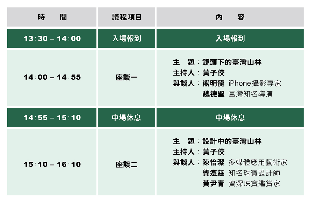 為了啟發欣賞臺灣山林的視角,昇恆昌珠寶特別舉辦「與山林對話」跨界講座,從各界專家不同的角度,透過鏡頭、設計與山林對話,一起探索臺灣山林之美。