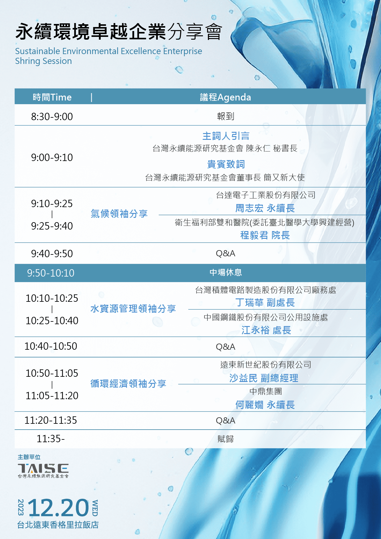 本次分享會特別邀請今(2023)年度 台灣企業永續獎(TCSA)永續單項績效-E永續環境類 之獲獎單位,台積電、台達電子、中鼎集團、中國鋼鐵、遠東新世紀、衛生福利部雙和醫院(委託臺北醫學大學興建經營)等,共同分享在環境領域如何解決問題與突破創新。本次分享會由「氣候、水資源管理、循環經濟」三大面向組成,集結獲獎企業共同探討面對氣候變遷時,如何減緩調適,建構永續安全的供水系統,以及強化資源循環利用與發展創新模式。