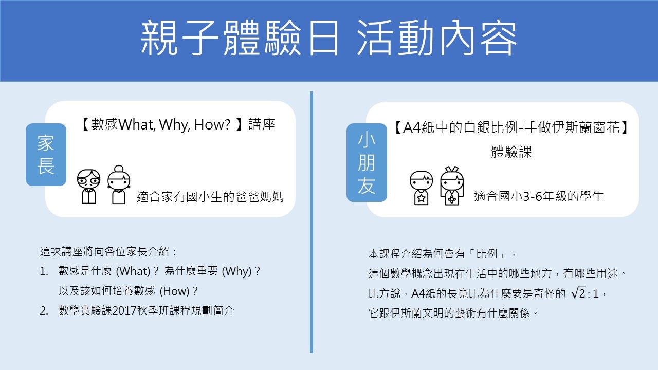 本次親子體驗日,針對家長方面,我們將詳盡介紹數感實驗室理念及2017年秋季數學實驗課程規劃。針對小朋友的部分,我們將提供一堂2小時的體驗課程,讓小朋友發掘隱藏在生活中的數學,感受「原來數學也可以做實驗」的樂趣。歡迎親子一同參與!