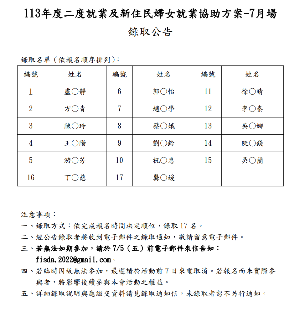 Accupass 活動頁公告正/備取名單 | 113 年 7 月 1 日(一) |