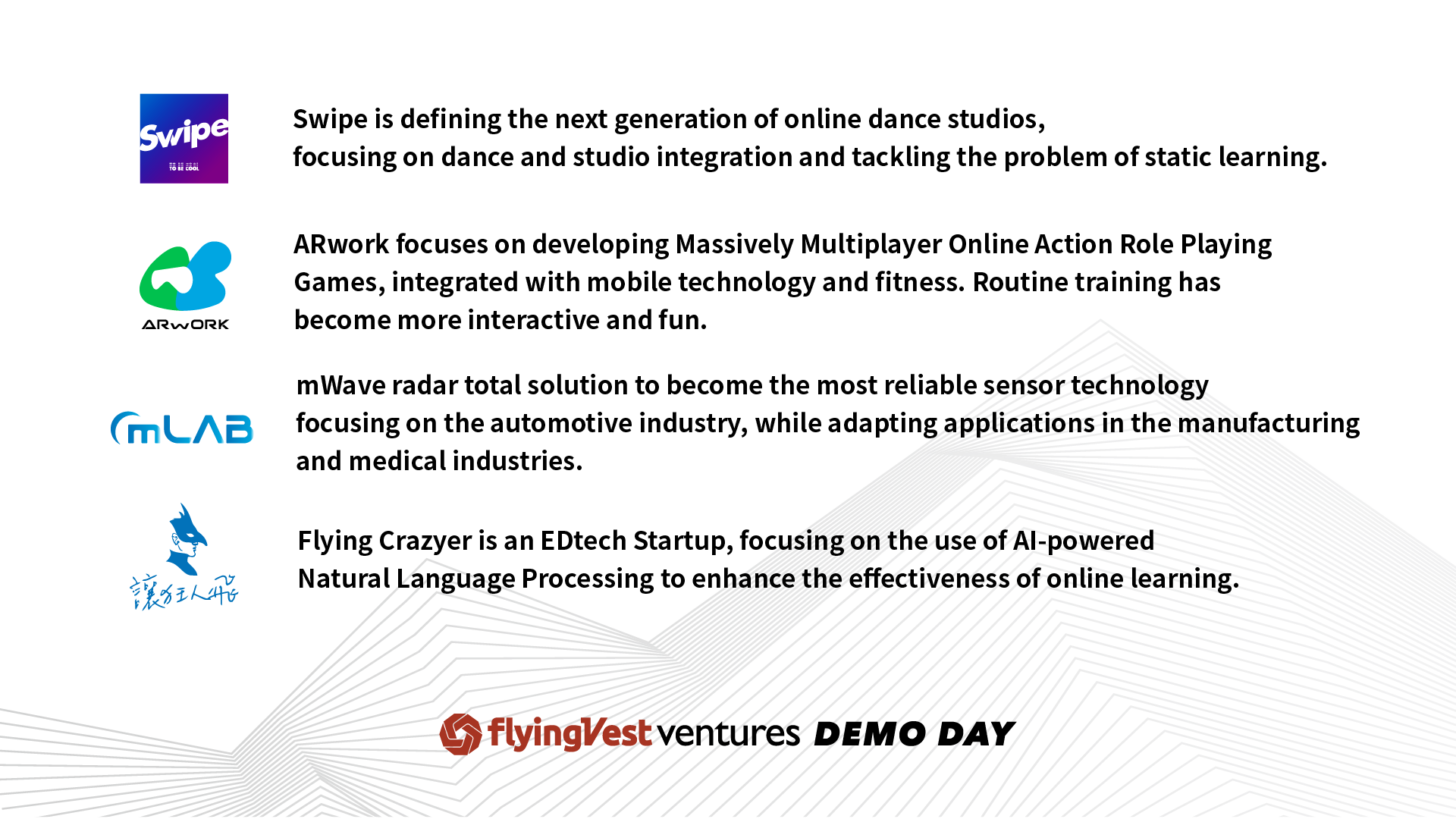 flyingVest Ventures presents our first Demo Day of 2022. Swipe, ARwork, mLAB, and FlyingCrazyer will demo their milestones of this year and their roadmap moving forward.