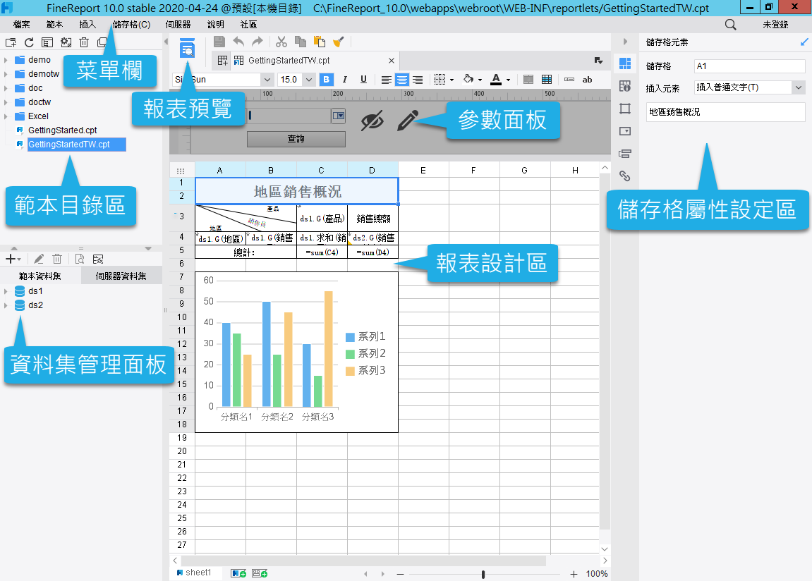 報表目錄檔案區/資料來源編輯區/參數面板/報表設計區/儲存格屬性設定區