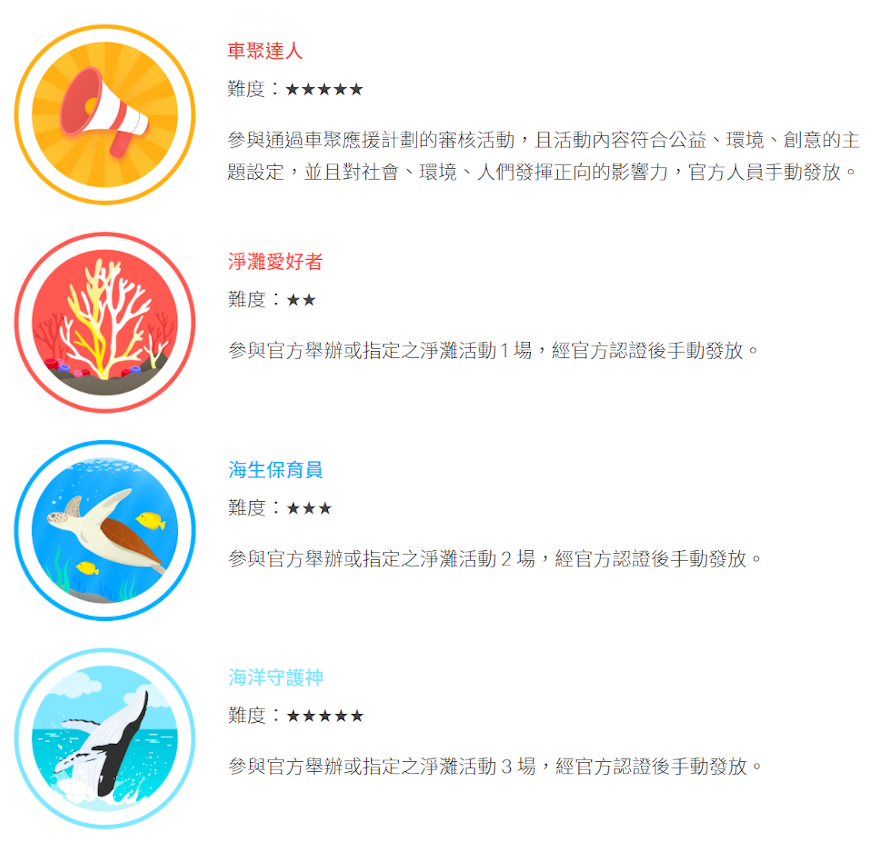 - 本次虛擬徽章僅為 gogoro 車主專屬,參加本次活動可取得 車聚達人,剩餘三個淨灘徽章,Gogoro 官方將會於活動後認定您參加過幾場,而給予對應的徽章,若是您目前未參加過 Gogoro 主辦或協辦之任何淨灘活動者,參與本次活動將至少獲得 淨灘愛好者 徽章。