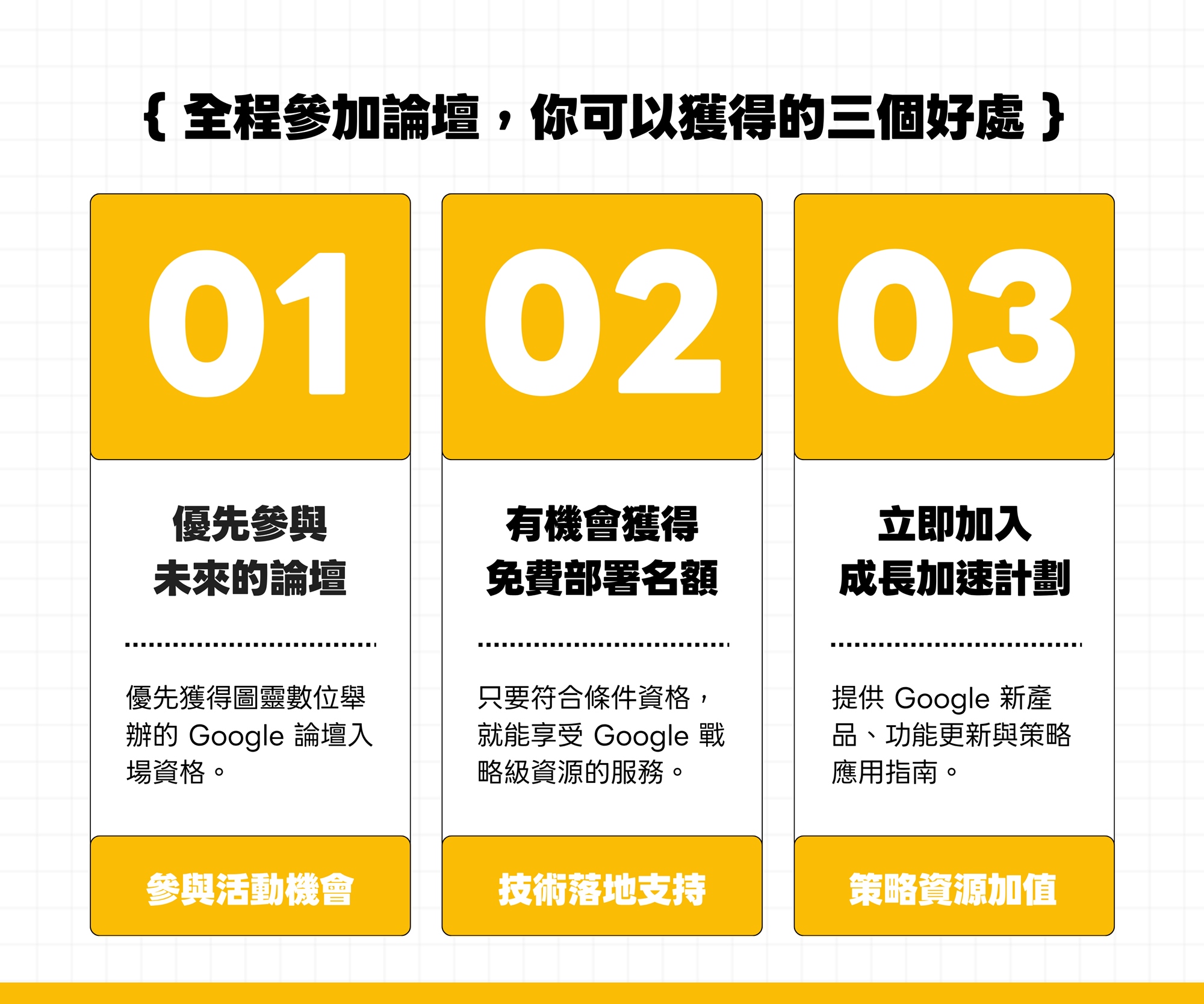 好處一:參與活動機會(優先參與未來的論壇)優先獲得圖靈數位舉辦的 Google 論壇入場資格。