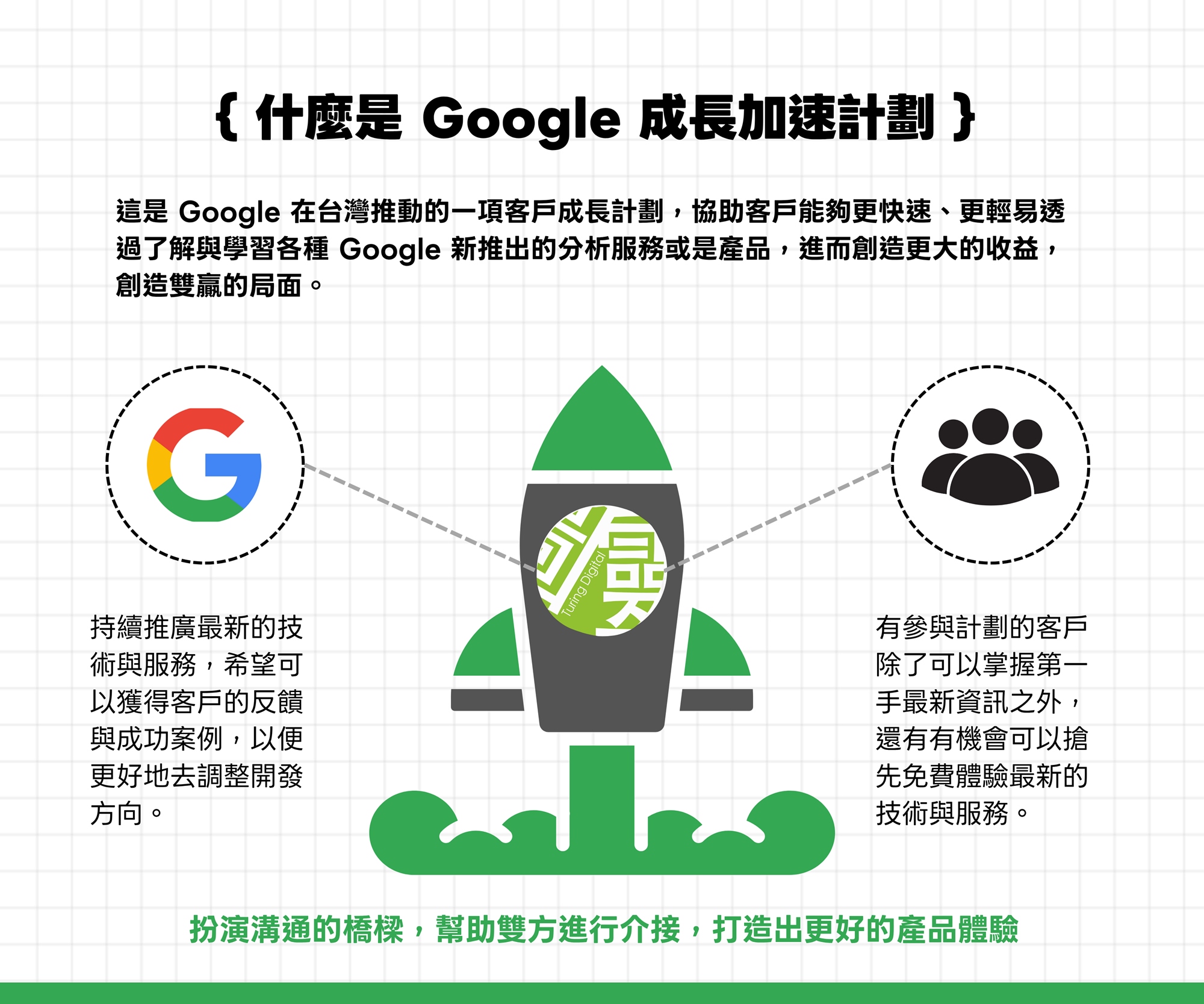 這是 Google 在台灣推動的一項客戶成長計劃,協助客戶能夠更快速、更輕易透過了解與學習各種 Google 新推出的分析服務或是產品,進而創造更大了收益,創造雙贏的局面。