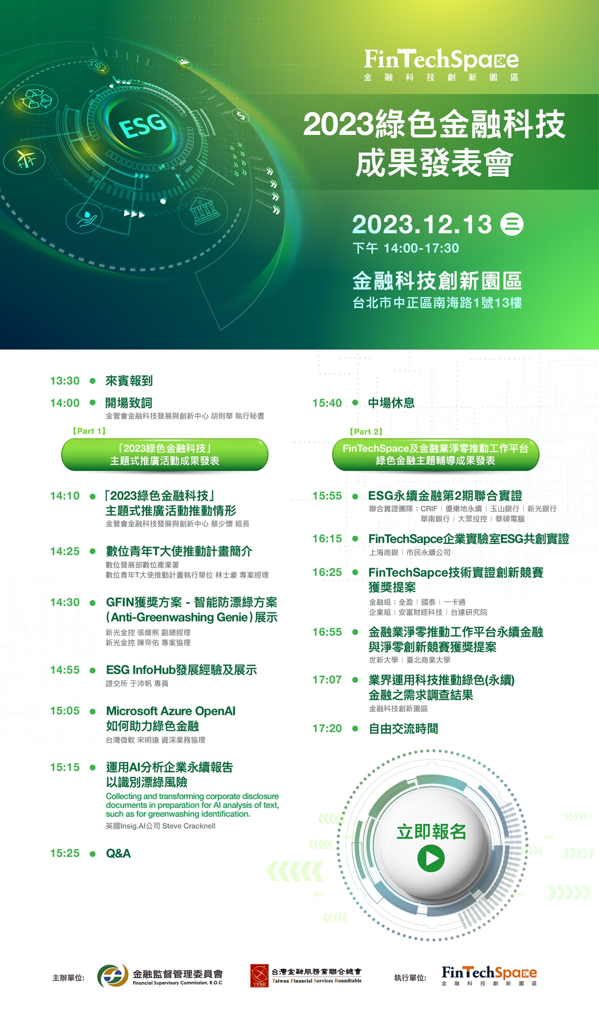 為展現今年各項辦理成果,金管會與金融總會共同舉辦「2023綠色金融科技」成果發表會,邀請金融機構、金融科技業者、ESG相關資訊服務業者及其他對綠色(永續)金融或金融科技議題有興趣者踴躍參加。