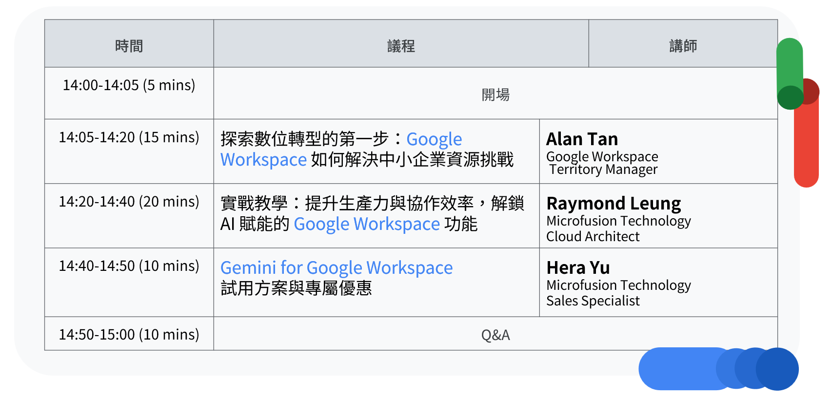 本次研討會將重點介紹 Google Workspace 如何作為一個綜合解決方案,幫助企業突破瓶頸,推動數位轉型的成功轉變。無論是自動化工作流程、智能文檔管理,還是 AI 驅動的洞察分析,Google Workspace 提供了創新資源讓企業能夠在有限的資源下實現更多目標。