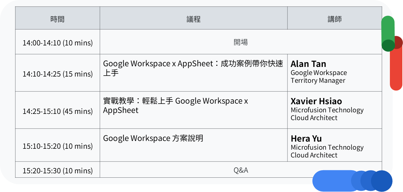 - 適合對象:企業決策者、IT 人員、Google Workspace 用戶,希望拓展應用場景、對無程式碼開發平台感興趣的任何人