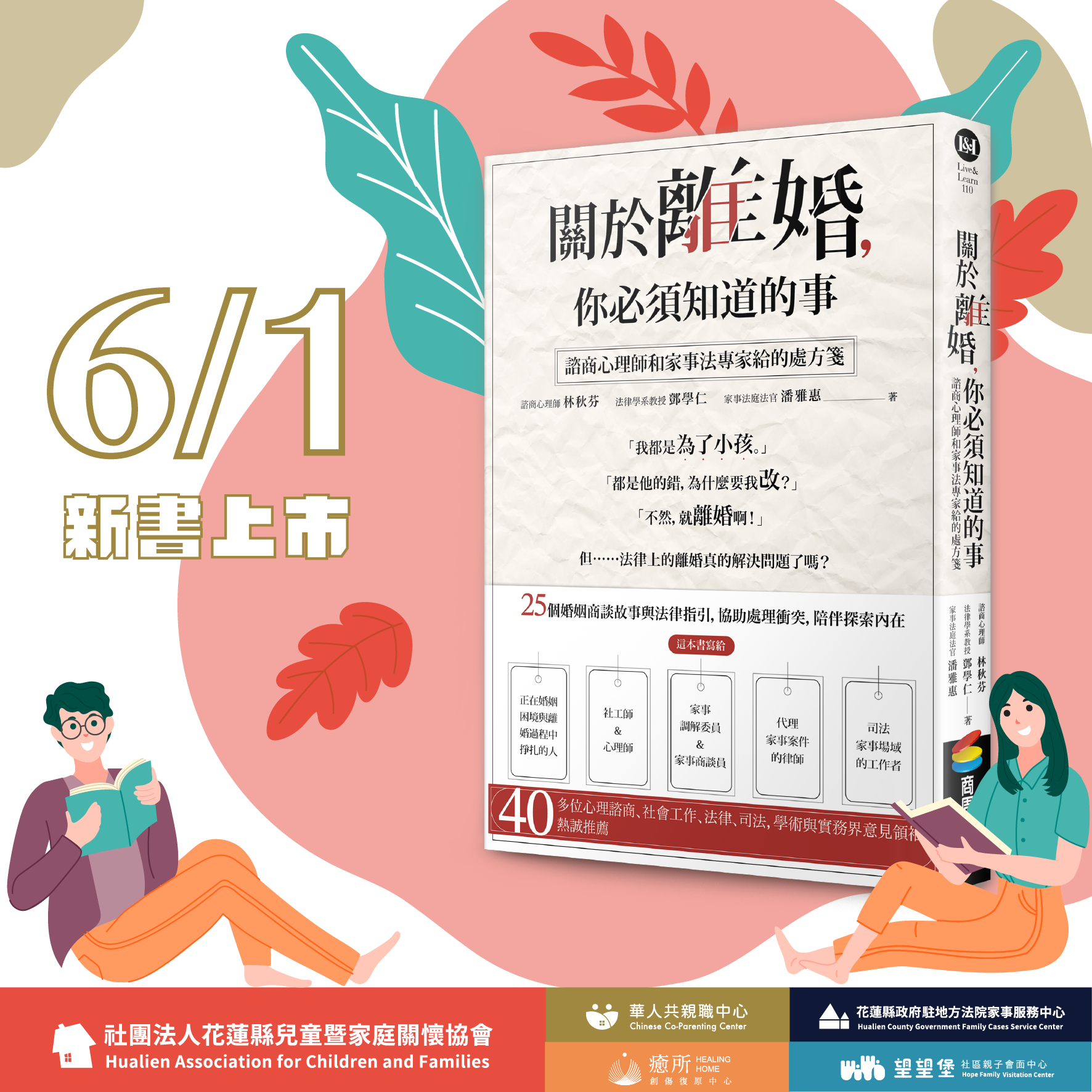 本次講座採線上線下同步進行,現場將於7/22週六下午三點花蓮遠百誠品,邀請主持人王迺燕醫師與三位作家,來現場與大家一同分享離異共親職理念。