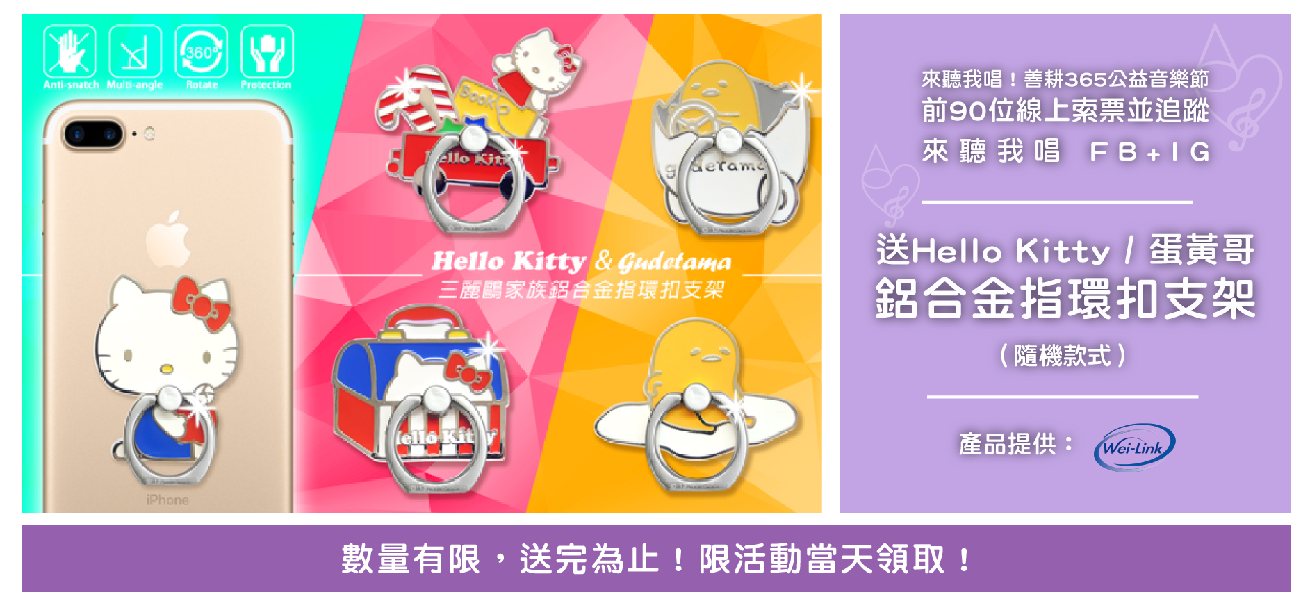 加碼送 Hello Kitty&蛋黃哥「鋁合金指環扣支架」乙個(款式隨機,限量90份,送完為止!)
