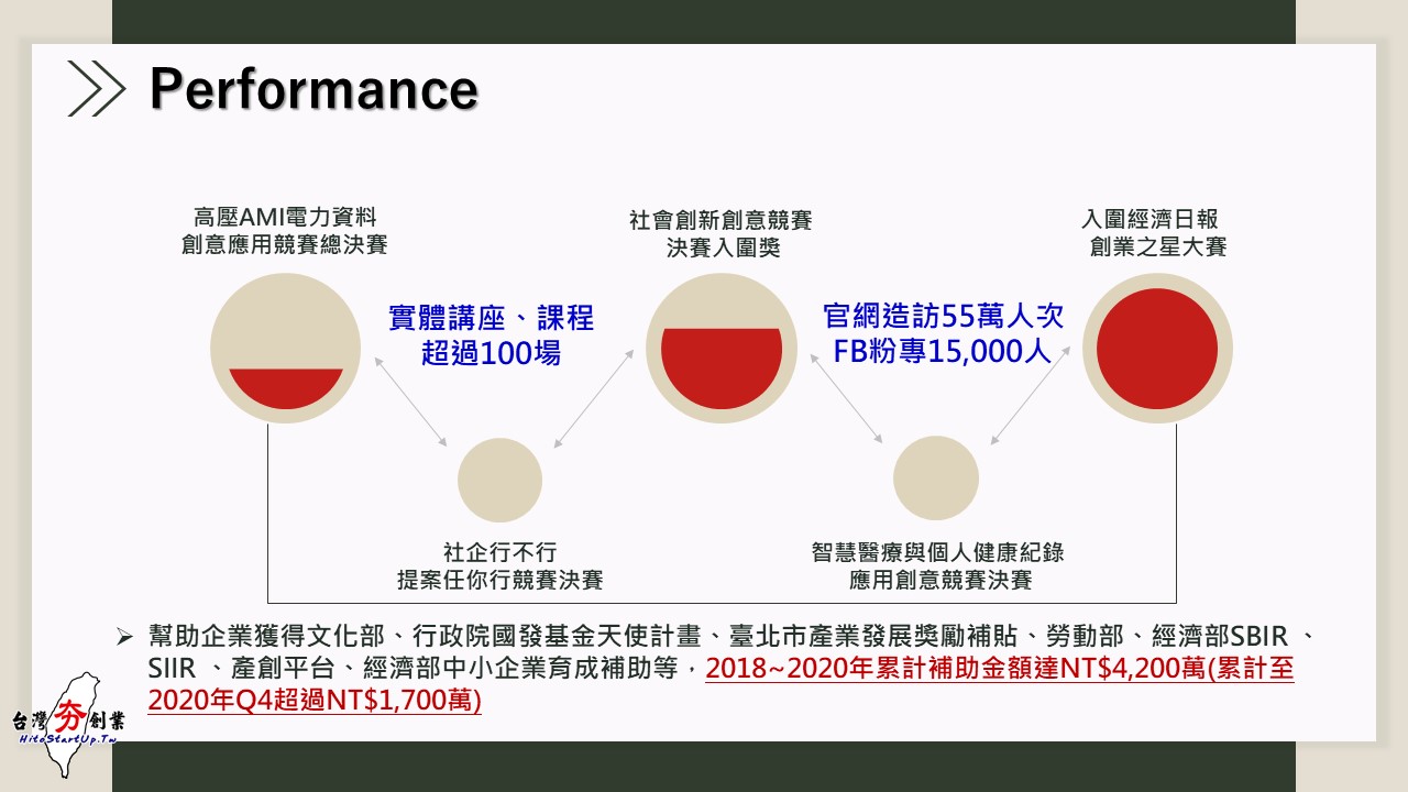 本團隊曾主導並協助客戶產品榮獲資訊月百大產品創新獎、新創事業獎、婦女創業菁英賽、雲端創新應用服務競賽、新興產業加速育成計畫育成先鋒獎、經理人月刊百大經理人,通過計畫項目囊括文化部、台北市地方型研發補助、行政院國發基金天使計畫、臺北市產業發展獎勵補貼、勞動部、經濟部SBIR/SIIR、台北市產發局合作計畫等計畫。自2016年起累積獲補助金額已超過NT$4,200萬以上,輔導領域包含研發、文創、大型專案等,為您從創業草創期、擴張期到成長期提供完整的政府補助申請輔導,直至獲得補助後亦提供後續服務到計畫結束,讓您無後顧之憂。