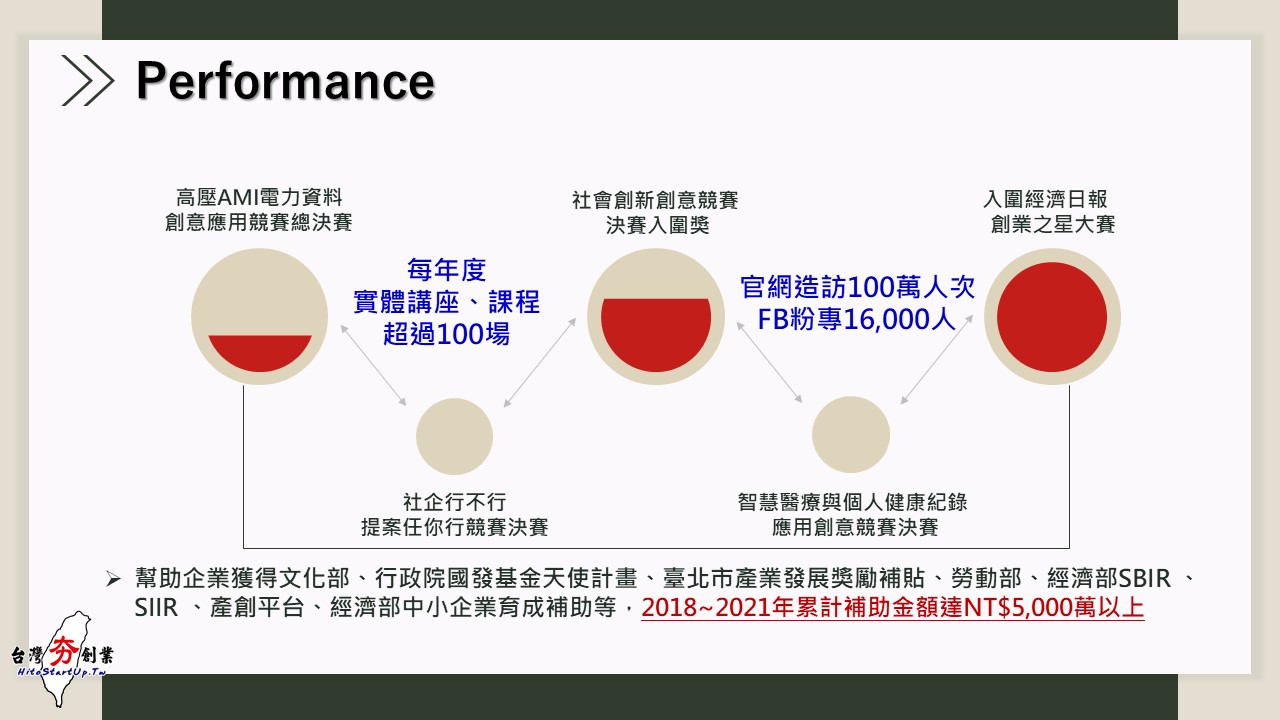 本團隊曾主導並協助客戶產品榮獲資訊月百大產品創新獎、新創事業獎、婦女創業菁英賽、雲端創新應用服務競賽、新興產業加速育成計畫育成先鋒獎、經理人月刊百大經理人,通過計畫項目囊括文化部、台北市地方型研發補助、行政院國發基金天使計畫、臺北市產業發展獎勵補貼、勞動部、經濟部SBIR/SIIR、台北市產發局合作計畫等計畫。自2016年起累積獲補助金額已超過NT$4,200萬以上,輔導領域包含研發、文創、大型專案等,為您從創業草創期、擴張期到成長期提供完整的政府補助申請輔導,直至獲得補助後亦提供後續服務到計畫結束,讓您無後顧之憂。