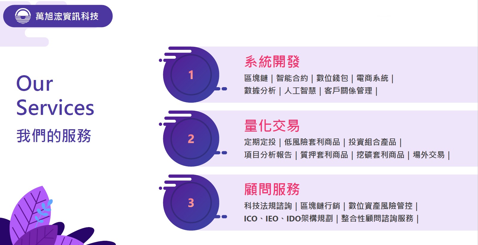 想瞭解元宇宙及NFT初步概念及產業應用的群眾、或您對於萬旭浤資訊科技所提供區塊鏈技術端在 "系統開發"、"量化交易"、"顧問服務"等相關內容(如下圖)想進一步瞭解,或有解決方案規劃等相關需求,不論您是B端廠商客群或一般的C端投資者,有稅務、法律或系統端相關問題,都歡迎聆聽本課程,並於課後進行付費預約諮詢!