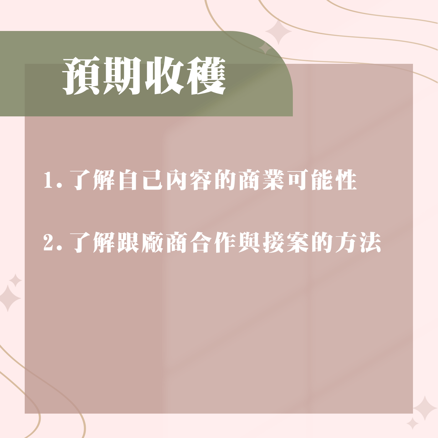 - 品牌喜歡什麼樣的創作者、圖文的趨勢種類、如何將自己內容跟商業搭上線,讓經驗豐富的操盤手一次告訴你。