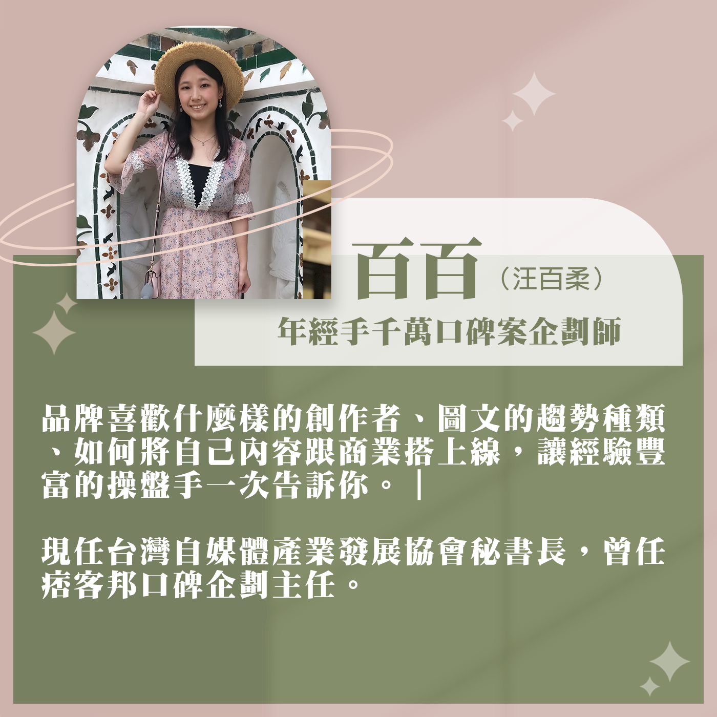 - 講師介紹:年經手千萬口碑案企劃師,品牌喜歡什麼樣的創作者、圖文的趨勢種類、如何將自己內容跟商業搭上線,讓經驗豐富的操盤手一次告訴你,現任台灣自媒體產業發展協會秘書長,曾任痞客邦口碑企劃主任。