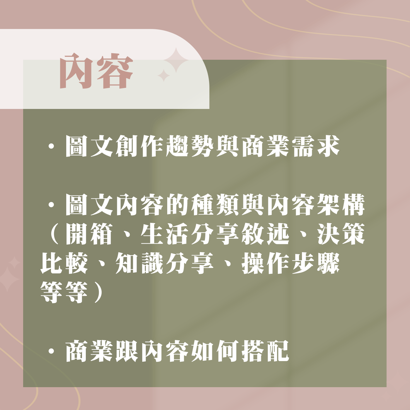 - 課程介紹:圖文創作趨勢與商業需求-圖文內容的種類與內容架構(開箱、生活分享敘述、決策比較、知識分享、操作步驟等等)-商業跟內容如何搭配
