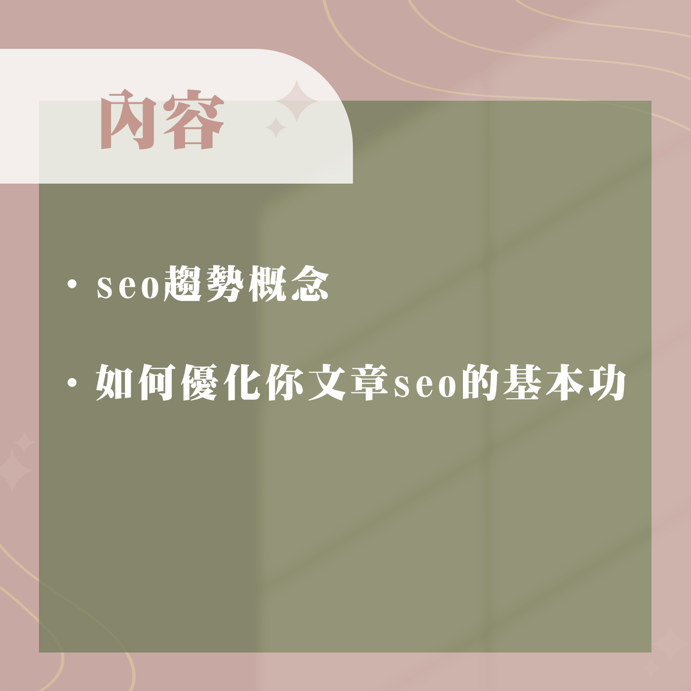 - 課程內容:SEO趨勢概念-如何優化你文章SEO的基本功