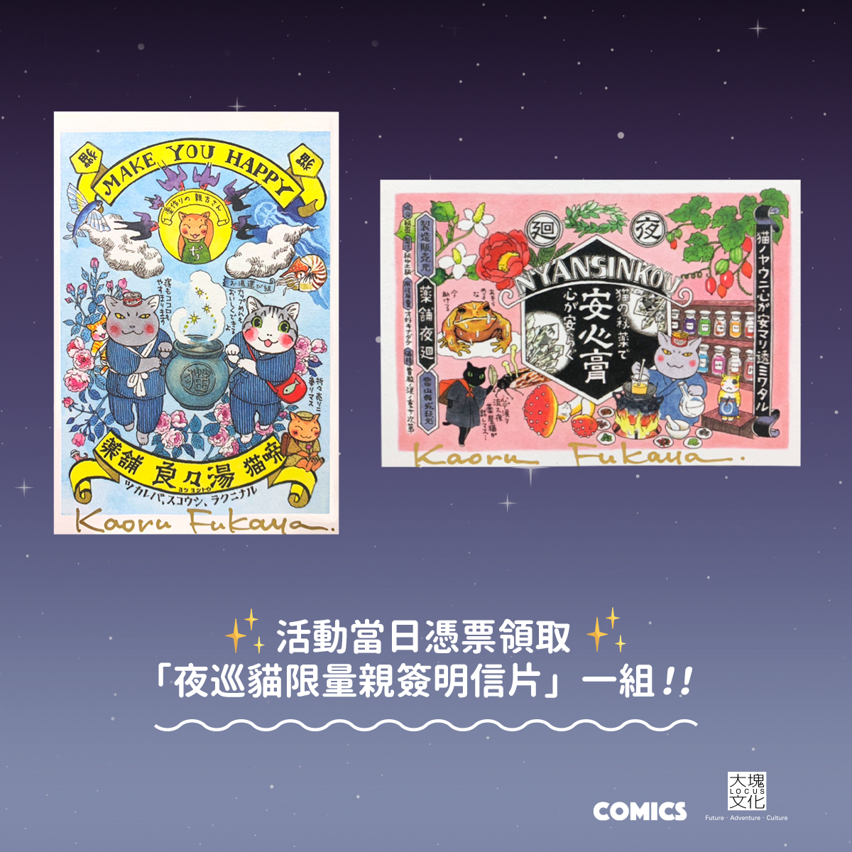 599元/人,活動當日憑票領取《夜巡貓7+8》一套+「夜巡貓限量明信片」一組(書籍原定價640元)