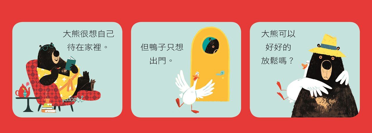 沉穩的大熊,有個活潑好動的鄰居鴨子,他們雖然感情好的不得了,但也常常吵架。
