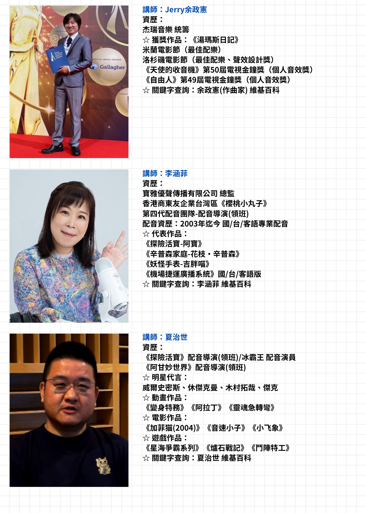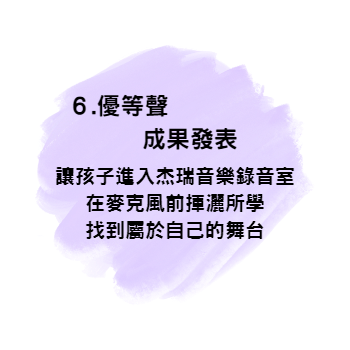 • 獨家專屬聲音履歷:由杰瑞之星課程統籌、金鐘最佳音效設計余政憲老師親自操刀,為孩子量身設計專屬的聲音電子履歷,獨家授權給學員個人專用。