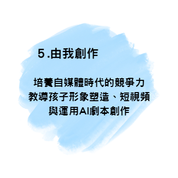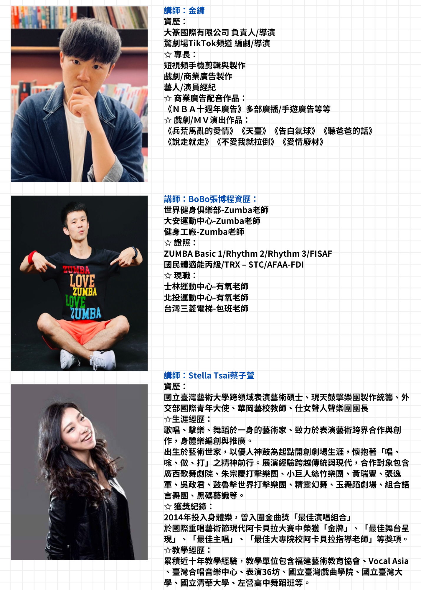 • 我的酷炫短視頻:由資深藝人經紀,同時也是驚劇場TikTok頻道的編劇/導演金鏞老師,親自傳授快速簡便的短視頻創作技巧,讓孩子們發揮自己的想像力、邏輯構圖能力、鍛鍊專注力, 激發無限的的創作潛能。作品同時也能用於藝術類升學考試的實務呈現。