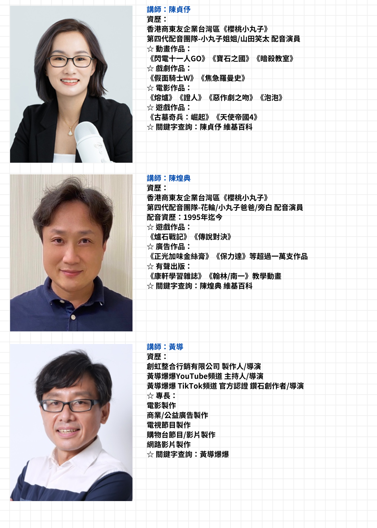 • 變聲超專業達人:資深配音演員陳煌典老師,同時也是資深專業的廣播節目主持人,豐富的配音與播音主持表演經歷,讓孩子認識自己聲音的特色,學會說故事以及控制聲音的變化能力。