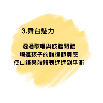 • 全方位形體表演:蔡子萱老師為全方位的歌唱音樂舞蹈家,擁有最豐富的跨界表演藝術經歷,她將帶領孩子透過歌唱與肢體表演遇見更好的自己。