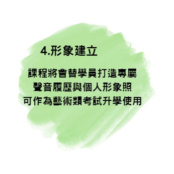 • 我的魅力形象照:由資深專業導演,同時現為百萬知名短視頻網紅的黃導爆爆主持人-黃導為孩子們量身打造拍攝專業形象照,同時將電子聲音履歷結合專屬個人形象照更可做為藝術表演類升學考試使用,業界首創。