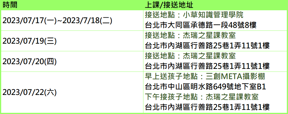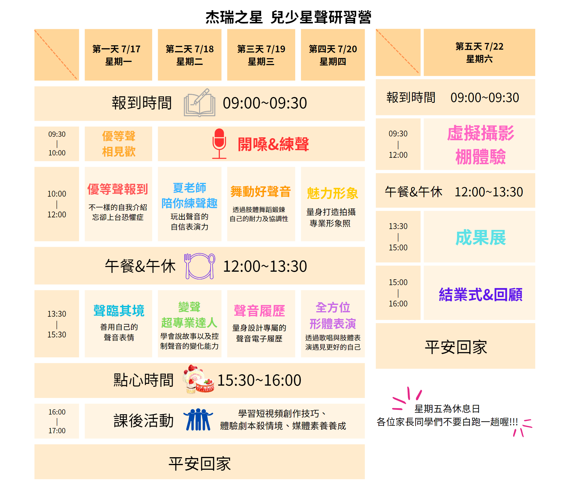• 優等生成果發表:經過了四天的精實訓練,最後孩子們將會活用四天所學,進入錄音棚做團體成果發表,這不僅是讓學員有面對鏡頭的經驗,更能讓他們從練習中學習團隊合作與溝通。發表日當天的下午家長可至現場觀看小朋友的成果展演。