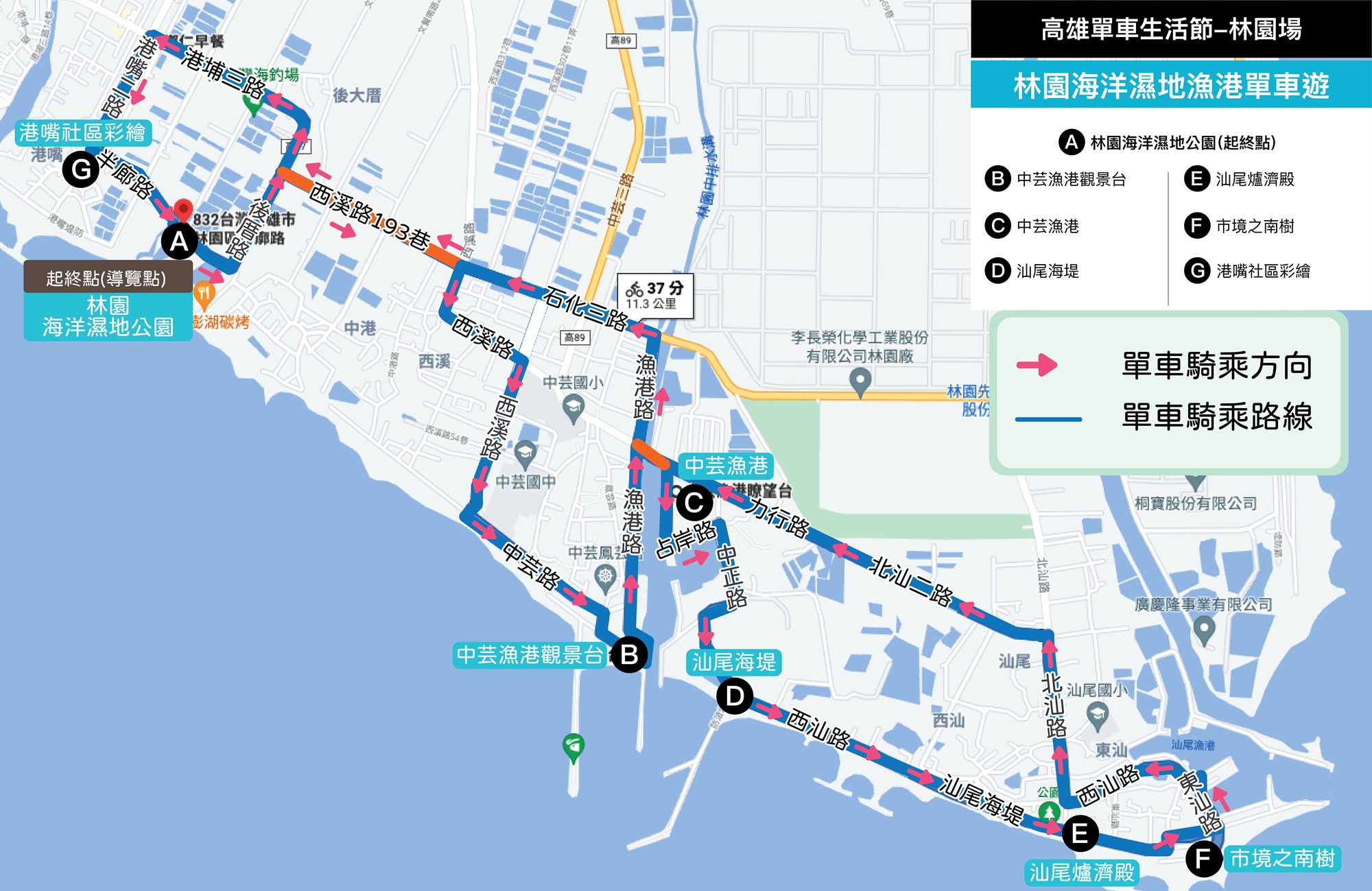林園海洋濕地公園▶▶中芸漁港觀景台▶▶中芸漁港▶▶汕尾海堤▶▶汕尾爐濟殿▶▶市境之南樹/方塊海▶▶港嘴社區彩繪▶▶林園海洋濕地公園&【乘風而騎】海洋舞台音樂會+單車市集