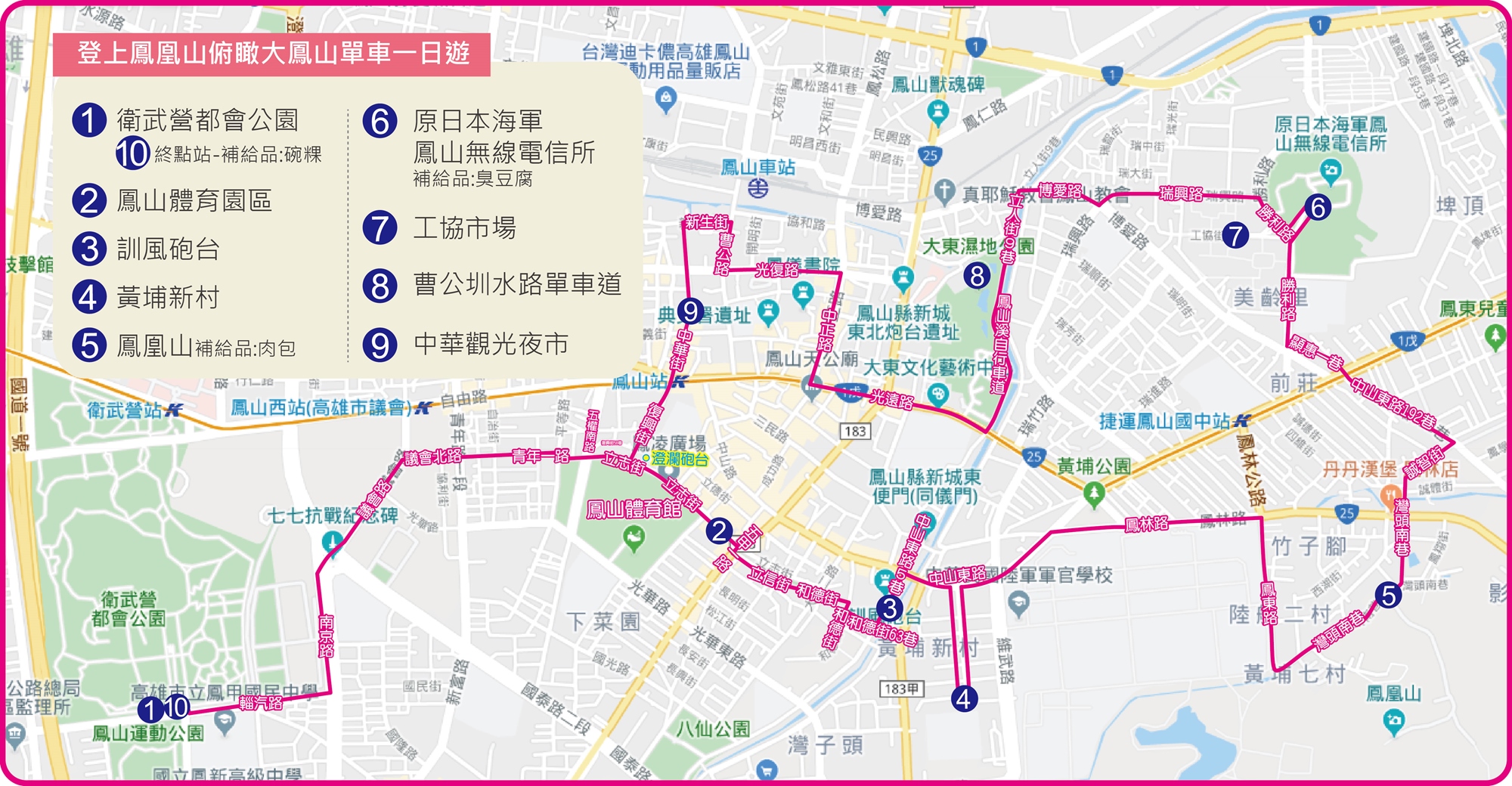 騎乘路經衛武營都會公園、鳳山體育園區、訓風砲台、黃埔新村、鳳凰山、原日本海軍鳳山無線電信所、工協市場、曹公圳水路單車道、中華觀光夜市等景點,全程約15公里的路程,鳳山古城充滿獨特人文景點與自然景觀,一路上眾多軍事與眷村景點回憶舊日時光、市場美食便宜擱大碗、馳騁單車道河岸景觀令人心曠神怡!