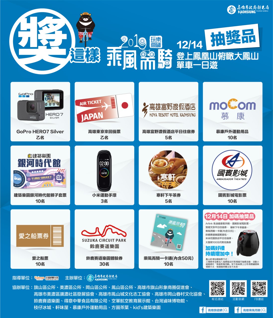 活動路線上安排當地眷村美食,如碗粿、臭豆腐、包子等作為補給,吃喝玩樂一應俱全,還有GoPro運動攝影機、鈴鹿賽道遊樂園遊園券、小米運動手環等多樣大獎等你抽!帶著歡喜雀躍的心,一起來【登上鳳凰山俯瞰大鳳山單車一日遊】盡情遨遊!