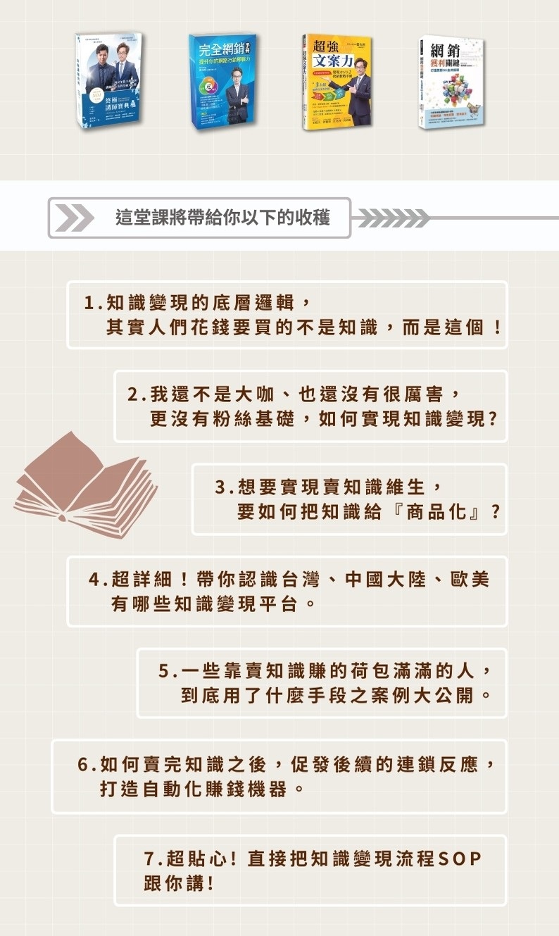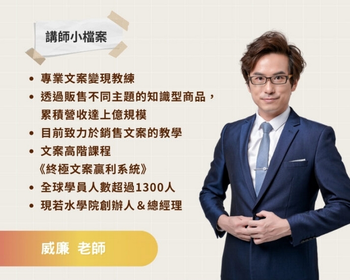 知識變現專家,擁有多年教學經驗,開發出超過5萬人受益的全球知識變現系統,曾出版《超強文案力》《網銷獲利關鍵》等暢銷書,專精於教導如何銷售知識產品,幫助學員開啟收入新篇章。