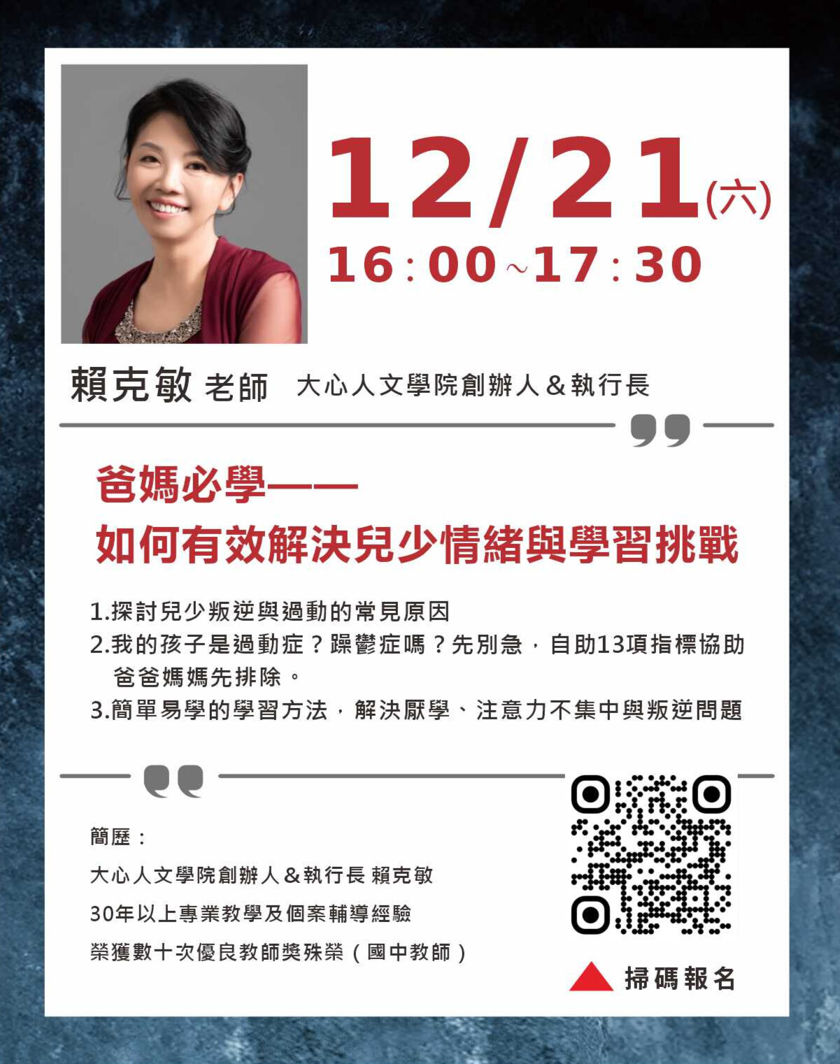 賴克敏老師為大心人文學院的創辦人及現任執行長,擁有逾30年的專業教學與個案輔導經驗。其教育事業深耕多年,致力於推動全人教育理念,並在教師生涯中屢次榮獲優良國中教師的殊榮,展現其在教學專業與學生輔導上的卓越能力與成就。賴老師的教育哲學以啟發心智、培養健全人格為核心,廣受學生、家長及教育界的高度評價。