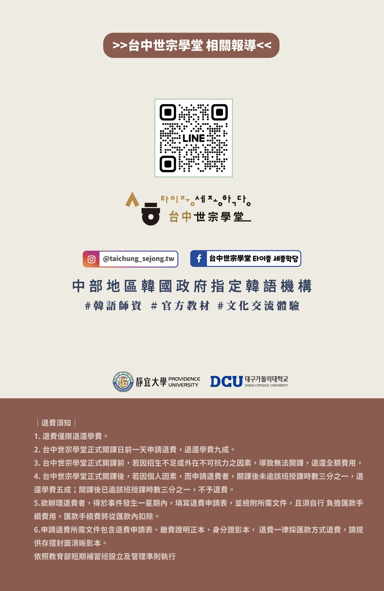 官方Facebook :https://www.facebook.com/sejong.taichung/