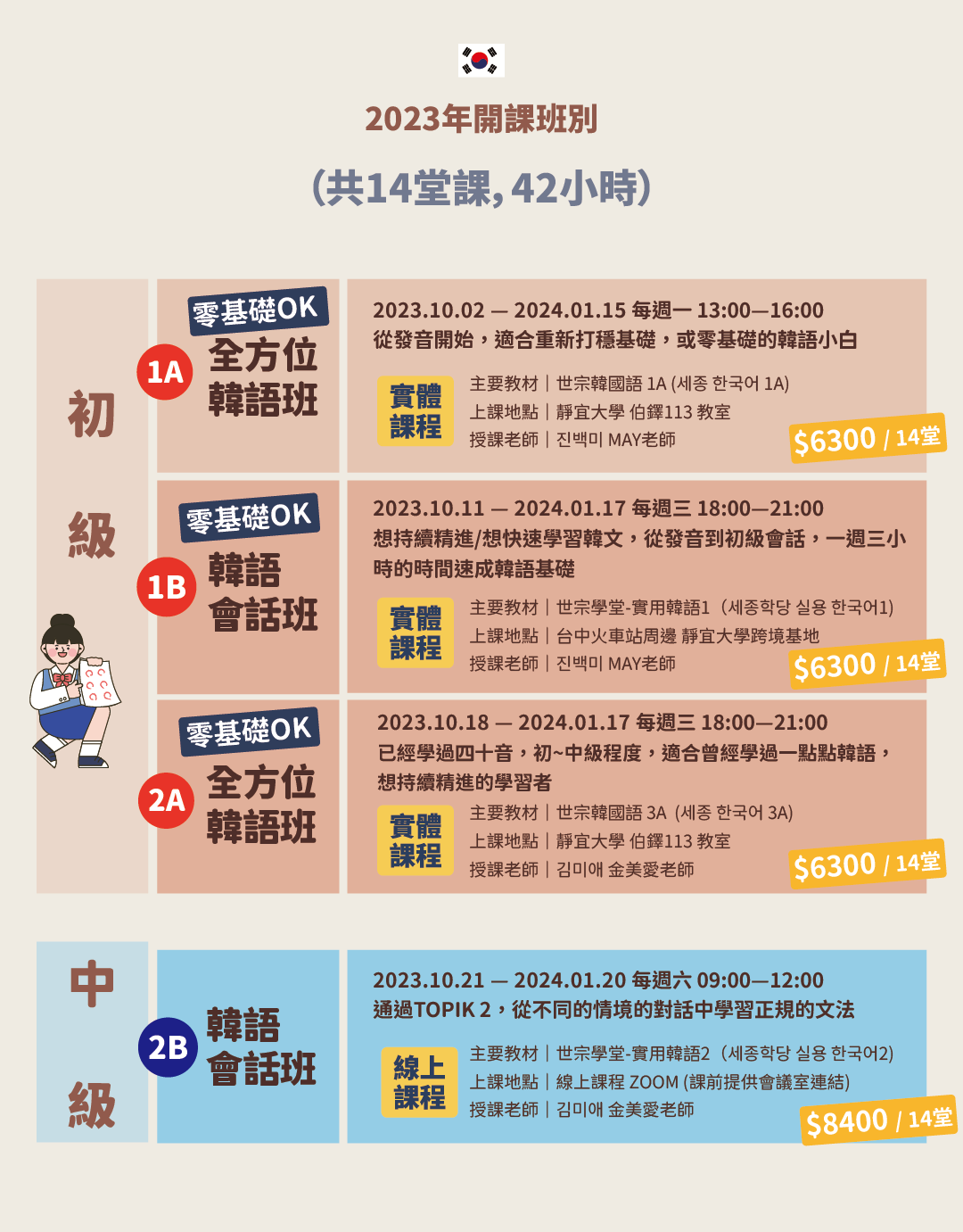 零基礎的同學們毫無懸念的 直上『 1A 初級全方位韓語班』、『 1B 初級韓語會話班』就對了!