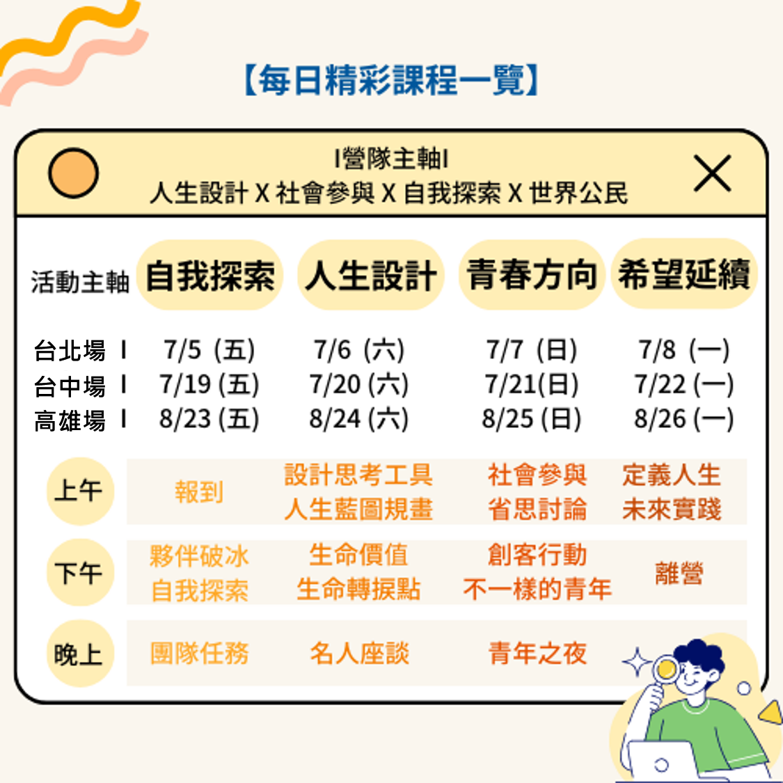 在一個闖蕩的年紀,不斷地探求自己的目標,不計代價的放手一搏,嘗試各種可能性,在這浩瀚的人生殿堂裡,你找到自我了嗎?2024年大專青年營裡頭,我們將帶領各位夥伴,以人生設計|社會參與|自我探索|世界公民 四大學習主題,共同跳脫現有的舒適圈框架,創造新的可能性,為自己的未來人生方向掌舵!其實改變世界的起源,都是從你我的一個想法、一個行動開始!你的天賦是什麼?透過營隊和夥伴一同洞察自我,改變世界!