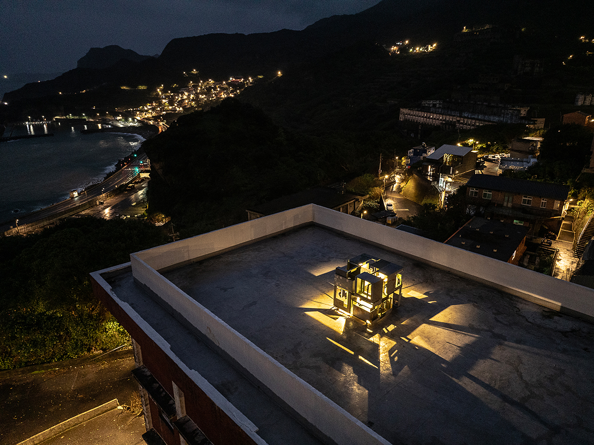 這件燈光裝置位於展覽頂樓,使用切割後的殘破變電箱堆疊排放,嘗試在混亂破碎的結構中,堆疊出簡約的線條找到秩序,像倉庫收納,也像是真實的人生一樣。燈光裝置電燈時間為營業日傍晚5點至9點。頂樓展區因安全考量,平時不開放,只在限定場次開放,請參考下方展覽門票說明。