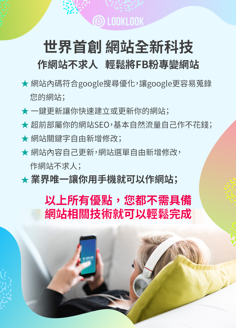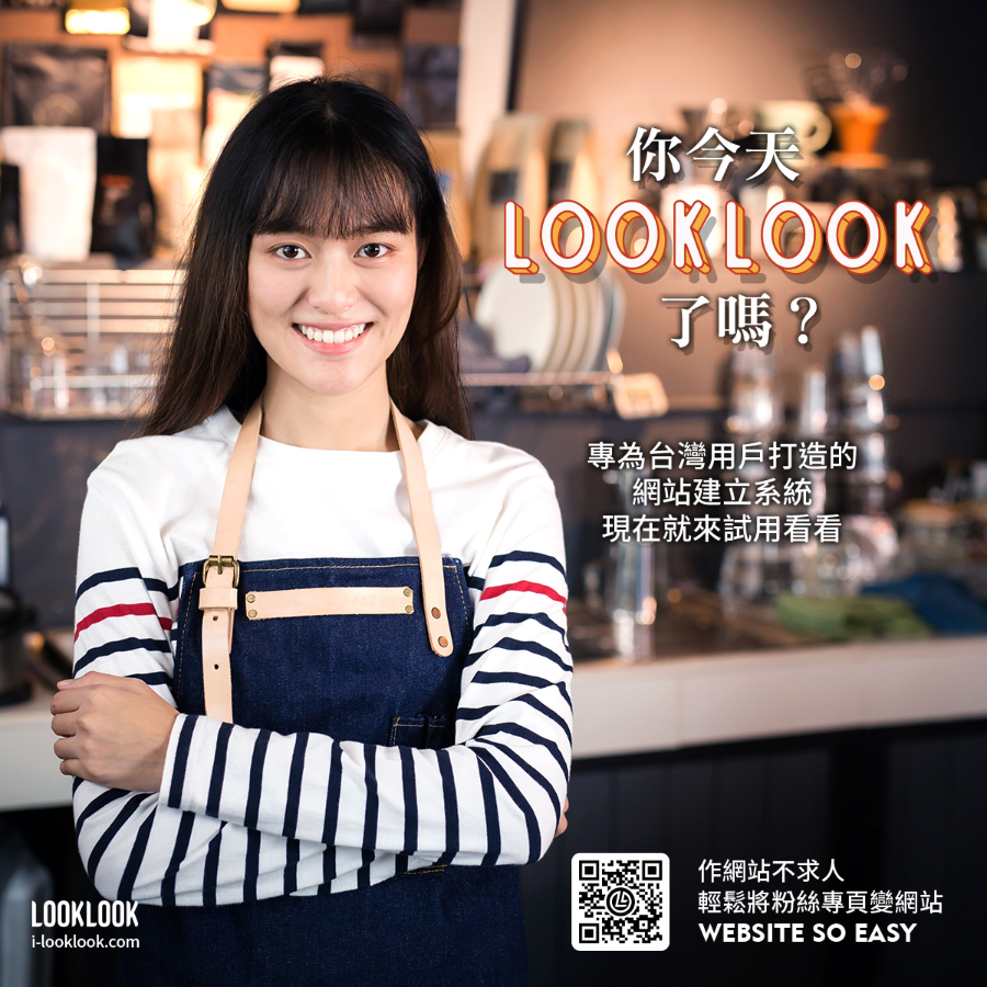 LOOKLOOK看看線上科技為了讓每一個想要有網站但卻礙於價錢貴、製作繁瑣、人手不夠、後續維護麻煩等等因素而遲遲無法擁有一個自己網站的朋友們。LOOKLOOK看見了這個不方便進而開始思考如何讓一個網站創建是方便、低價並且不增加人力負擔的方法。LOOKLOOK做到了,讓我們一起將Facebook粉絲專頁變網站吧!您將體驗一個網站的成立是如此的輕鬆簡單。